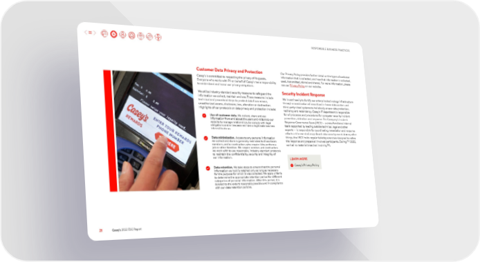 RESPONSIBLE BUSINESS PRACTICES Customer Data Privacy and Protection Our Privacy Policy provides further detail on the types of customer Casey’s is committed to respecting the privacy of its guests. information that is collected, and how that information is collected, Everyone who works with PII on behalf of Casey’s has a responsibility used, transmitted, stored and shared. For more information, please to understand and honor our privacy obligations. see our Privacy Policy on our website. We utilize industry-standard security measures to safeguard the Security Incident Response information we collect, maintain and use. These measures include We invest heavily to fortify our enterprise technology infrastructure technical and procedural steps to protect data from misuse, through a combination of securitized in-house data centers and unauthorized access, disclosure, loss, alteration or destruction. third-party cloud systems to holistically ensure data protection, Highlights of our protocols on data privacy and protection include: resiliency and redundancy. Casey’s IT department is responsible Use of customer data. We collect, share and use for all processes and procedures for computer security incident information from and about the users and visitors to our prevention, detection and response. The Company’s Incident website to manage relationships, to comply with legal Response Governance Team (IRGT) — a cross-functional internal obligations and/or because we have a legitimate business team supported by leading outside technical, legal and other interest to do so. experts — is responsible for coordinating remediation and response efforts in the event of a significant data security event. Among other Data minimization. Access to any personal information things, the IRGT holds regular tabletop exercises designed to refine we collect and store is generally restricted to those team the response and prepare all involved participants. During FY 2022, members and/or contractors who require it to perform a we had no material breaches involving PII. job or other function. We require vendors and contractors we work with to use reasonable, industry-standard protocols to maintain the confidentiality, security and integrity of our information. LEARN MORE Data retention. We take steps to ensure that the personal Casey’s Privacy Policy information we hold is retained only as long as necessary for the purpose for which it was collected. We apply criteria to determine the appropriate retention period for different categories of personal information. After this period, it is deleted to the extent reasonably possible and in compliance with our data retention policies. 21 Casey’s 2022 ESG Report