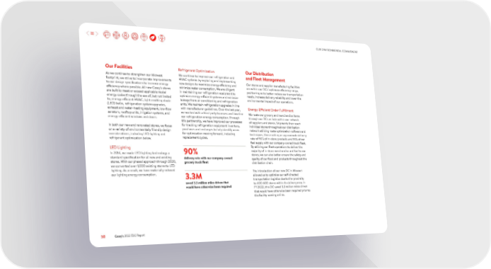 OUR ENVIRONMENTAL COMMITMENT Our Facilities Refrigerant Optimization Our Distribution As we continue to strengthen our Midwest We continue to improve our refrigeration and and Fleet Management footprint, we strive to incorporate improvements HVAC systems by exploring and implementing Our stores and supplier manufacturing facilities to our design specifications to increase energy new designs to maximize energy efficiency and are within our DCs’ optimum efficiency range, efficiency where possible. All new Casey’s stores minimize water consumption. We are diligent positioning us to better reduce our transportation are built to meet or exceed applicable model in maintaining our refrigeration equipment to needs, increase delivery reliability and lower the energy codes through the use of, but not limited optimize energy-efficient systems and minimize environmental impact of our operations. to, energy-efficient HVAC, light-emitting diode leakage from air conditioning and refrigeration (LED) bulbs, refrigeration system upgrades, units. We maintain refrigeration upgrades in line Energy-Efficient Order Fulfillment exhaust and water-heating equipment, low-flow with manufacturer guidelines. Over the last year, aerators, rooftop units, irrigation systems, and we worked with a third party to assess and baseline We route our grocery and merchandise items energy-efficient windows and doors. our refrigeration energy consumption. Through through our DCs as hubs within our network this partnership, we have improved our processes of suppliers and stores. Shipments then reach In both our new and renovated stores, we focus for tracking refrigeration equipment inventory, individual stores throughout our distribution on a variety of environmentally friendly design purchases and recharges to help identify areas network utilizing route optimization software and considerations, including LED lighting and for optimization moving forward, including techniques, thus enabling an approximate delivery refrigerant optimization below. replacement cycles. rate of 90% of in-store products and 55% of our fuel supply with our company-owned truck fleet. LED Lighting By utilizing our fleet operations to deliver the In 2014, we made LED lighting technology a 90% majority of in-store merchandise and fuel to our standard specification for all new and existing stores, we can also better ensure the safety and delivery rate with our company-owned quality of our food and products throughout the stores. With our phased approach through 2020, grocery truck fleet distribution chain. we converted over 1,000 existing stores to LED lighting. As a result, we have materially reduced The introduction of our new DC in Missouri our lighting energy consumption. 3.3M allowed us to optimize our self-directed saved 3.3 million miles driven that transportation logistics due to the proximity would have otherwise been required to 400-600 stores within its delivery area. In FY 2022, this DC saved 3.3 million miles driven that would have otherwise been required prior to the facility coming online. 50 Casey’s 2022 ESG Report