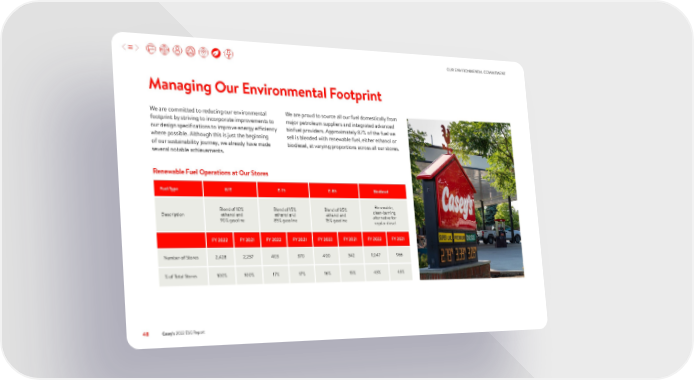 OUR ENVIRONMENTAL COMMITMENT Managing Our Environmental Footprint We are committed to reducing our environmental We are proud to source all our fuel domestically from footprint by striving to incorporate improvements to major petroleum suppliers and integrated advanced our design specifications to improve energy efficiency biofuel providers. Approximately 87% of the fuel we where possible. Although this is just the beginning sell is blended with renewable fuel, either ethanol or of our sustainability journey, we already have made biodiesel, at varying proportions across all our stores. several notable achievements. Renewable Fuel Operations at Our Stores Fuel Type 87E E-15 E-85 Biodiesel Blend of 10% Blend of 15% Blend of 85% Renewable, Description ethanol and ethanol and ethanol and clean-burning 90% gasoline 85% gasoline 15% gasoline alternative for regular diesel FY 2022 FY 2021 FY 2022 FY 2021 FY 2022 FY 2021 FY 2022 FY 2021 Number of Stores 2,428 2,237 403 370 400 342 1,047 966 % of Total Stores 100% 100% 17% 17% 16% 15% 43% 43% 48 Casey’s 2022 ESG Report