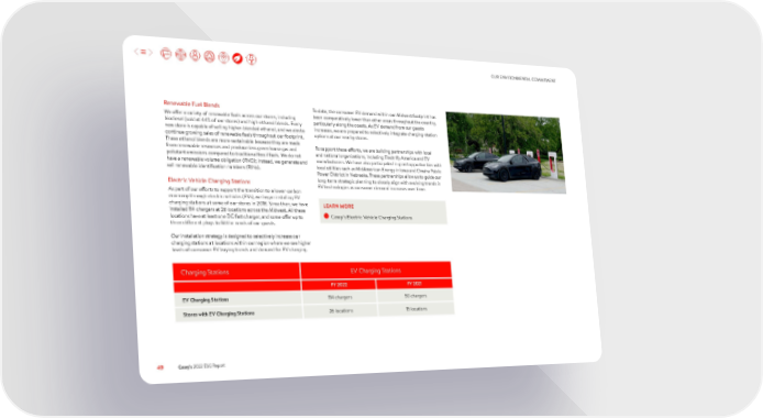 OUR ENVIRONMENTAL COMMITMENT Renewable Fuel Blends To date, the consumer EV demand within our Midwest footprint has We offer a variety of renewable fuels across our stores, including been comparatively lower than other areas throughout the country, biodiesel (sold at 44% of our stores) and high-ethanol blends. Every particularly along the coasts. As EV demand from our guests new store is capable of selling higher-blended ethanol, and we aim to increases, we are prepared to selectively integrate charging-station continue growing sales of renewable fuels throughout our footprint. options at our nearby stores. These ethanol blends are more sustainable because they are made To support these efforts, we are building partnerships with local from renewable resources and produce less greenhouse gas and and national organizations, including Electrify America and EV pollutant emissions compared to traditional fossil fuels. We do not manufacturers. We have also participated in grant opportunities with have a renewable volume obligation (RVO); instead, we generate and local utilities such as MidAmerican Energy in Iowa and Omaha Public sell renewable identification numbers (RINs). Power District in Nebraska. These partnerships allow us to guide our Electric Vehicle Charging Stations long-term strategic planning to closely align with evolving trends in As part of our efforts to support the transition to a lower-carbon EV technologies as consumer demand increases over time. economy through electric vehicles (EVs), we began installing EV charging stations at some of our stores in 2018. Since then, we have LEARN MORE installed 114 chargers at 26 locations across the Midwest. All these locations have at least one DC fast charger, and some offer up to Casey’s Electric Vehicle Charging Stations three different plugs to fit the needs of our guests. Our installation strategy is designed to selectively increase our charging stations at locations within our region where we see higher levels of consumer EV buying trends and demand for EV charging. Charging Stations EV Charging Stations FY 2022 FY 2021 EV Charging Stations 114 chargers 50 chargers Stores with EV Charging Stations 26 locations 15 locations 49 Casey’s 2022 ESG Report