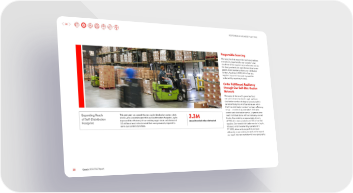 RESPONSIBLE BUSINESS PRACTICES Responsible Sourcing We recognize that responsible business practices are not only important for our operations but also those of the suppliers upon whom we rely for the food, products and operations critical to our guests, team members, stores and distribution centers. As of April 2022, 63% of our top suppliers by spend have publicly available sustainability reporting in place. Order Fulfillment Resiliency through Our Self-Distribution Network We supply all stores with groceries, food and general merchandise through our three distribution centers strategically located within our store footprint. All of our stores are within the three distribution centers’ optimum efficiency range — a radius of approximately 500 miles around each distribution center. Shipments then Expanding Reach This past year, we opened the new Joplin distribution center, which 3.3M reach individual stores with our company-owned of Self-Distribution allows us to accelerate growth in our southwestern footprint. Joplin trucks, thus enabling an approximate delivery Footprint improved the efficiency of our existing supply chain and eliminated annual traveled miles eliminated of 90% of in-store products and 55% of our fuel 3.3 million annual miles traveled that were previously required to supplies. Our newest distribution center in Joplin, serve our current store base. Missouri, which became fully operational in FY 2022, allows us to support stores more efficiently in our existing network and to expand our reach into new markets within our geography. 23 Casey’s 2022 ESG Report