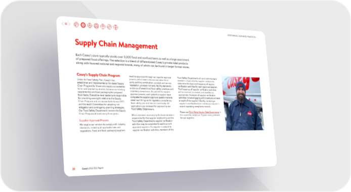 RESPONSIBLE BUSINESS PRACTICES Supply Chain Management Each Casey’s store typically stocks over 3,000 food and nonfood items as well as a large assortment of prepared food offerings. The selection is a blend of differentiated Casey’s private-label products along with favored national and regional brands, many of which can be found in larger format stores. Casey’s Supply Chain Program must be approved through our supplier approval Food Safety Department will work with the team Under its Food Safety Plan, Casey’s has process, which takes into consideration third- members responsible for supplier relations to established and implemented a risk-based Supply party auditing certification, product and service determine the type and frequency of supplier Chain Program for those who supply consumables reputation, product risk level, facility standards, verification activities for each approved supplier. to be sold (excluding alcohol, tobacco and dietary evidence of established food safety practices, and The frequency of supplier verification activities supplements) and food packaging for prepared regulatory compliance. As part of the supplier will be assessed, as needed, and modified as food items. Executive-level leaders are responsible approval process, each potential supplier must appropriate. Examples of supplier verification for providing oversight relative to the Supply complete the supplier approval questionnaire to activities include engaging a third party to conduct Chain Program and are accountable to our CEO detail such things as its regulatory compliance, an audit of the supplier’s facility, reviewing a and the Audit Committee for adopting risk food safety plan and business continuity. All supplier’s certification(s) or reviewing a supplier’s mitigation and contingency-planning strategies. applications are reviewed for approval by our recent regulatory compliance records. Our Food Safety Department reviews the Supply Food Safety Department. Chain Program at least every three years. Please see Third-Party Vendor Data Governance in Where deemed necessary by the team members this report for details on IT governance protocols Supplier Approval Process responsible for the supplier relationship and the for our suppliers. Food Safety Department, supplier verification We require our vendors to comply with industry activities may be completed to audit current standards, including all applicable laws and approved suppliers. If a supplier is subject to regulations. Food and food packaging suppliers supplier verification activities, members of the 22 Casey’s 2022 ESG Report