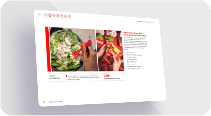 RESPONSIBLE BUSINESS PRACTICES Implementing Responsible Standards for Our Private Brands During FY 2022, we continued to successfully expand our private-brand portfolio to over 250 Casey’s brand snacks, sweet treats and more. Not only can we provide our guests greater value through these private-label products, but we also gain greater visibility and control of sustainable standards for this important line of business, such as: • Label integrity • Allergen information transparency • Nutritional elements • Recyclable packaging • Delivery efficiency • Consumer value • Preservative-free ingredients • Human rights compliance Casey’s During FY 2022, we grew Casey’s private-brand portfolio 250+ Private Brands to over 250 products, bringing even more quality, value and private-brand product portfolio selection to our guests. 25 Casey’s 2022 ESG Report