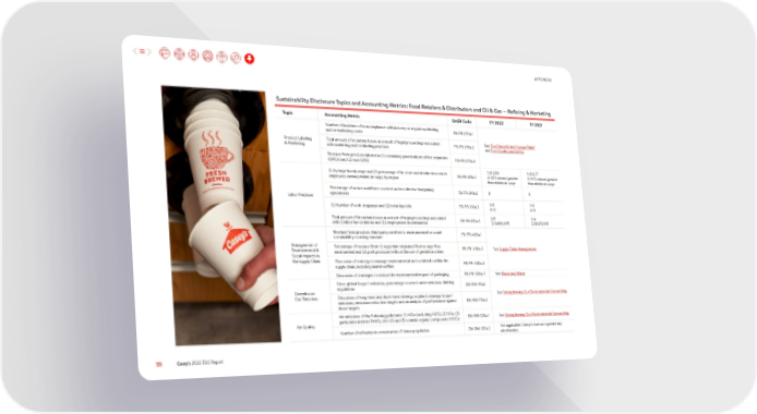 APPENDIX Sustainability Disclosure Topics and Accounting Metrics: Food Retailers & Distributors and Oil & Gas — Refining & Marketing Topic Accounting Metric SASB Code FY 2022 FY 2021 Number of incidents of noncompliance with industry or regulatory labeling FB-FR-270a.1 and/or marketing codes Product Labeling Total amount of monetary losses as a result of legal proceedings associated FB-FR-270a.2 See Food Security and Hunger Relief & Marketing with marketing and/or labeling practices and Food Quality and Safety Revenue from products labeled as (1) containing genetically modified organisms FB-FR-270a.3 (GMOs) and (2) non-GMO (1) Average hourly wage and (2) percentage of in-store and distribution center 1) $13.58 1) $12.77 employees earning minimum wage, by region FB-FR-310a.1 2) 92% earned greater 2) 94% earned greater than minimum wage than minimum wage Percentage of active workforce covered under collective bargaining FB-FR-310a.2 0 0 Labor Practices agreements (1) Number of work stoppages and (2) total days idle FB-FR-310a.3 1) 0 1) 0 2) 0 2) 0 Total amount of monetary losses as a result of legal proceedings associated FB-FR-310a.4 1) 0 1) 4 with (1) labor law violations and (2) employment discrimination 2) $488,605 2) $825,000 Revenue from products third-party certified to environmental or social FB-FR-430a.1 sustainability sourcing standard Management of Percentage of revenue from (1) eggs that originated from a cage-free FB-FR-430a.2 Environmental & environment and (2) pork produced without the use of gestation crates See Supply Chain Management Social Impacts in the Supply Chain Discussion of strategy to manage environmental and social risks within the FB-FR-430a.3 supply chain, including animal welfare Discussion of strategies to reduce the environmental impact of packaging FB-FR-430a.4 See Waste and Water Gross global Scope 1 emissions, percentage covered under emissions-limiting EM-RM-110a.1 Greenhouse regulations Gas Emissions Discussion of long-term and short-term strategy or plan to manage Scope 1 See Strengthening Our Environmental Stewardship emissions, emissions reduction targets and an analysis of performance against EM-RM-110a.2 those targets Air emissions of the following pollutants: (1) NOx (excluding N2O), (2) SOx, (3) EM-RM-120a.1 See Strengthening Our Environmental Stewardship Air Quality particulate matter (PM10), (4) H2S and (5) volatile organic compounds (VOCs) Number of refineries in or near areas of dense population EM-RM-120a.2 Not applicable: Casey’s does not operate any oil refineries. 55 Casey’s 2022 ESG Report