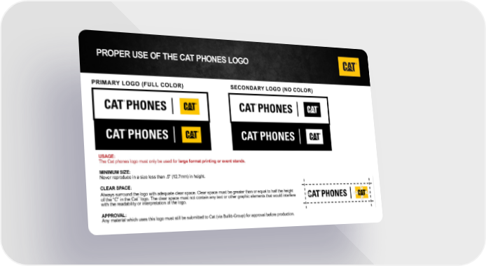 PROPER USE OF THE CAT PHONES LOGO PRIMARY LOGO (FULL COLOR) SECONDARY LOGO (NO COLOR) USAGE: The Cat phones logo must only be used for large format printing or event stands. MINIMUM SIZE: Never reproduce in a size less than .5” (12.7mm) in height. CLEAR SPACE: Always surround the logo with adequate clear space. Clear space must be greater than or equal to half the height of the “C” in the Cat¨ logo. The clear space must not contain any text or other graphic elements that would interfere with the readability or interpretation of the logo. APPROVAL: Any material which uses this logo must still be submitted to Cat (via Bullitt-Group) for approval before production.