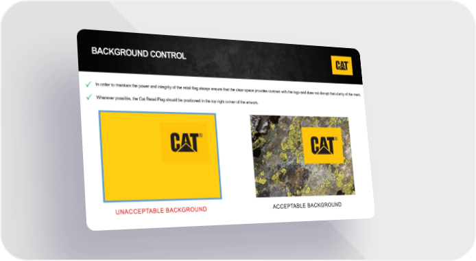 BACKGROUND CONTROL P In order to maintain the power and integrity of the retail flag always ensure that the clear space provides contrast with the logo and does not disrupt that clarity of the mark. P Wherever possible, the Cat Retail Flag should be positioned in the top right corner of the artwork. UNACCEPTABLE BACKGROUND ACCEPTABLE BACKGROUND