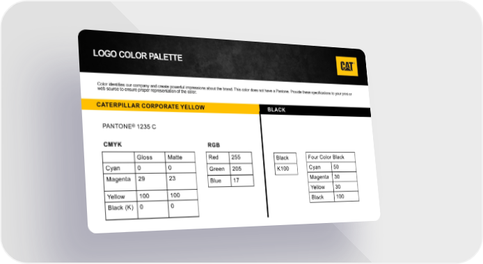 LOGO COLOR PALETTE Color identifies our company and create powerful impressions about the brand. This color does not have a Pantone. Provide these specifications to your print or web source to ensure proper representation of the color. CATERPILLAR CORPORATE YELLOW BLACK PANTONE®1235 C CMYK RGB Gloss Matte Red 255 Black Four Color Black Cyan 0 0 Green 205 K100 Cyan 50 Magenta 29 23 Blue 17 Magenta 30 Yellow 100 100 Yellow 30 Black (K) 0 0 Black 100