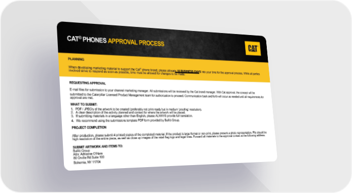 CAT® PHONES APPROVAL PROCESS PLANNING When developing marketing material to support the Cat® phone brand, please allocate 10 BUSINESS DAYS into your time for the approval process. While all parties involved strive to respond as soon as possible, time must be allowed for changes to be made. REQUESTING APPROVAL E-mail files for submission to your channel marketing manager. All submissions will be reviewed by the Cat brand manager. With Cat approval, the concept will be submitted to the Caterpillar Licensed Product Management team for authorization to proceed. Communication back and forth will occur as needed until all requirements for approval are met. WHAT TO SUBMIT: 1. PDF / JPEG’s of the artwork to be created (preferably not print-ready but in medium ‘proofing’ resolution). 2. A clear description of the activity planned and context for where the artwork will be placed. 3. If submitting materials in a language other than English, please ALWAYS provide full translation. 4. We recommend using the submissions template PDF form provided by Bullitt-Group. PROJECT COMPLETION After production, please submit 4 printed copies of the completed material. If the product is large format or non-print, please present a photo representation. File should be high resolution of the entire piece, as well as close up images of the retail flag logo and legal lines. Forward all materials to the approval contact at the following address: SUBMIT ARTWORK AND ITEMS TO: Bullitt Group Attn: Adrianne O’Hare 80 Orville Rd Suite 100 Bohemia, NY 11704