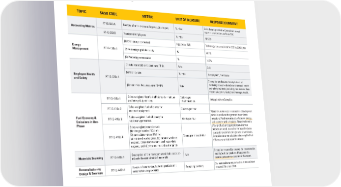 SASB INDEX TOPIC SASB CODE METRIC UNIT OF MEASURE RESPONSE/COMMENT RT-IG-000.A Number of units produced by product category Number Sales data is provided in Caterpillar's annual Accounting Metrics report to shareholders on Form 10-K. RT-IG-000.B Number of employees Number 107,700 (1) total energy consumed Gigajoules (GJ) Total energy consumed in GJ for 2021 is 20,600,000. Energy RT-IG-130a.1 (2) Percentage grid electricity % 86.7% Management (3) Percentage renewable % 24.2% (1) total recordable incident rate (TRIR) Rate 0.41 11 (2) fatality rate Number 0 employees , 1 contractor Employee Health RT-IG-320a.1 and Safety Caterpillar emphasizes the importance of (3) near miss frequency rate (NMFR) Rate reviewing all work-related environmental, health and safety incidents, including near misses. Near misses are communicated and managed locally. RT-IG-410a.1 Sales-weighted fleet fuel efficiency for medium- Gallons per Not applicable to Caterpillar. and heavy-duty vehicles 1,000 ton-miles RT-IG-410a.2 Sales-weighted fuel efficiency for Gallons per hour non-road equipment We continue to invest in research and development Fuel Economy & Sales-weighted fuel efficiency for aimed at products that generate fewer direct Emissions in Use- RT-IG-410a.3 stationary generators Watts per hour emissions. Read more about our focus on energy, Phase fuel economy and emissions. Given the diversity Sales-weighted emissions of: of our products and applications in which our (1) nitrogen oxides (NOx) and products are used, as well as the lack of industry RT-IG-410a.4 (2) particulate matter (PM) for: Grams per kilowatt-hour standards to estimate on a per unit of work basis, (a) marine diesel engines, (b) locomotive diesel Caterpillar does not calculate sales-weighted fuel engines, (c) on-road medium- and heavy-duty efficiency or emissions in this manner. engines, and (d) other non-road diesel engines Description of the management of risks associat- Caterpillar responsibly sources the raw materials Materials Sourcing RT-IG-440a.1 ed with the use of critical materials N/A used to build our products. Please see the material procurement section of this report. Remanufacturing RT-IG-440b.1 Revenue from remanufactured products and Reporting currency Our remanufacturing sales and revenues have Design & Services remanufacturing services reduced 3% since 2018. 61CATERPILLAR 2021 SUSTAINABILITY REPORT