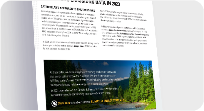EXECUTIVE SUMMARY CATERPILLAR TO BEGIN REPORTING SCOPE 3 GHG EMISSIONS DATA IN 2023 CATERPILLAR’S APPROACH TO GHG EMISSIONS Also in 2021, we further emphasized our commitment to reducing Caterpillar supports the goals of the Paris Agreement to limit global product-related emissions by disclosing an additional new goal temperature rise, and we are committed to contributing to a reduced- that 100% of our new products through 2030 will be more sustainable carbon future. We demonstrate our commitment by setting targets than the previous generation. and disclosing progress toward greenhouse gas (GHG) emissions In 2023, Caterpillar will provide our first-ever public disclosure of reduction goals. We announced our first sustainability goals in 2006 estimated Scope 3 emissions data (including for Category 11 – Use and refined them in 2013 to include a 50% reduction in Scope 1 and 2 of Sold Products), utilizing the Greenhouse Gas Protocol for reporting. GHG emissions intensity from 2006 to 2020. We actually achieved a Also of note, our first TCFD report will also be published in 2023. 51% reduction against this goal. We will continue to be transparent about our goals, progress and In 2021, we set seven new sustainability goals for 2030. Among them is innovations and are committed to continue enhancing our climate a new goal to further reduce absolute Scope 1 and 2 GHG emissions and sustainability disclosures. by 30% between 2018 and 2030. At Caterpillar, we have a legacy of providing products and services that continually improve the quality of life and the environment by fulfilling society’s need for infrastructure including shelter, clean water, transportation and reliable energy – in a sustainable way. In 2021, we released our Climate & Energy Statement, which reflects our commitment to contributing to a reduced-carbon future. Click here to read our updated CLIMATE & ENERGY STATEMENT. 4