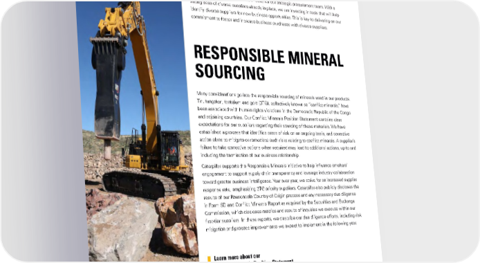 MATERIAL PROCUREMENT SUPPLIER DIVERSITY Supplier diversity continues to be a focus for our strategic procurement team. With a strong base of diverse suppliers already in place, we are investing in tools that will help identify diverse suppliers for new business opportunities. This is key to delivering on our commitment to foster and increase business purchases with diverse suppliers. RESPONSIBLE MINERAL SOURCING Many considerations go into the responsible sourcing of minerals used in our products. Tin, tungsten, tantalum and gold (3TG), collectively known as “conflict minerals,” have been associated with human rights violations in the Democratic Republic of the Congo and adjoining countries. Our Conflict Minerals Position Statement contains clear expectations for our suppliers regarding their sourcing of these materials. We have established a process that identifies areas of risk on an ongoing basis, and corrective action plans to mitigate or remediate such risks relating to conflict minerals. A supplier’s failure to take corrective actions when required may lead to additional actions, up to and including the termination of our business relationship. Caterpillar supports the Responsible Minerals Initiative to help influence smelters’ engagement to support supply chain transparency and leverage industry collaboration toward greater business intelligence. Year over year, we strive for an increased supplier response rate, emphasizing 3TG priority suppliers. Caterpillar also publicly discloses the results of our Reasonable Country of Origin process and any necessary due diligence in Form SD and Conflict Minerals Report as required by the Securities and Exchange Commission, which discloses metrics and results of inquiries we execute within our first-tier suppliers. In these reports, we describe our due diligence efforts, including risk mitigation and process improvements we expect to implement in the following year. Learn more about our Conflict Minerals Position Statement 33CATERPILLAR 2021 SUSTAINABILITY REPORT
