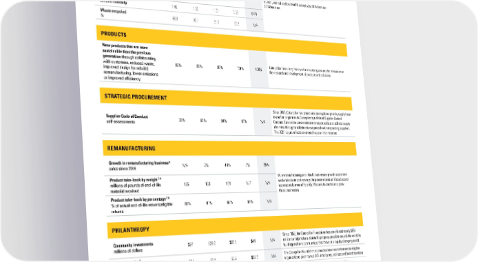 2018 2019 2020 2021 GOAL PERSPECTIVE 2030 WASTE — OPERATIONS Total waste 635,000 587,000 554,000 567,000 N/A metric tons Waste intensity absolute metrics tons of by-product 11.6 10.9 13.3 11.1 N/A materials/million dollars of sales and In 2021, we reduced our landfill intensity by 34% from our revenues 2018 baseline. Landfill intensity 1.49 1.36 1.09 0.98 0.74 Waste recycled 86.8 87.1 91.5 90.8 N/A % PRODUCTS New products that are more sustainable than the previous generation through collaborating Caterpillar has a long history of and a strong process for innovation in with customers, reduced waste, 89% 95% 97% 100% 100% the research and development of products and solutions. improved design for rebuild/ remanufacturing, lower emissions or improved efficiency. STRATEGIC PROCUREMENT Since 2016, Caterpillar has proactively surveyed our priority supply base Supplier Code of Conduct to confirm alignment to Caterpillar’s published Supplier Code of self-assessments 39% 67% 94% 96% N/A Conduct. Caterpillar uses assessment response data to address supply chain risk through a collaborative approach with responding suppliers. The 2021 target reflects continued focus on this initiative. REMANUFACTURING 6 Growth in remanufacturing business N/A 2% -14% -3% 25% sales since 2018 7, 8 Our remanufacturing and rebuild businesses provide customers Product take-back by weight with immediate cost savings, help extend product lifecycles and millions of pounds of end-of-life 155 153 131 127 N/A use materials more efficiently. We seek to continue to grow material received these businesses. 7, 8 Product take-back by percentage % of actual end-of-life returns/eligible 92% 91% 89% 88% N/A returns PHILANTHROPY Community investments Since 1952, the Caterpillar Foundation has contributed nearly $851 millions of dollars $27 $28.6 $37.9 $41 N/A million to help make sustainable progress possible around the world by building resilient communities that thrive in a rapidly changing world. 9 Matching gifts $4.1 $3.5 $9.8 $22.6 N/A The Caterpillar Foundation is proud to match contributions to eligible millions of dollars organizations given by our U.S. employees, retirees and board members. Caterpillar has supported the United Way for more than 10 United Way $11.8 $12.2 $12.3 $12.9 N/A 60 years through our annual campaign. The Foundation matches millions of dollars employee and retiree gifts during the campaign, amplifying our impact on the communities where we live and work. N/A = Not Applicable /A/ Data assured by ERM CVS. Please see our data assurance statement. 58CATERPILLAR 2021 SUSTAINABILITY REPORT