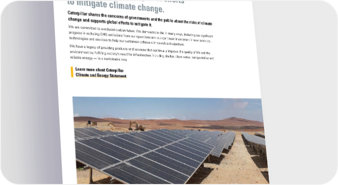 ENERGY, FUEL ECONOMY & EMISSIONS Caterpillar supports global efforts to mitigate climate change. Caterpillar shares the concerns of governments and the public about the risks of climate change and supports global efforts to mitigate it. We are committed to a reduced-carbon future. We demonstrate this in many ways, including our significant progress in reducing GHG emissions from our operations and our continued investment in new products, technologies and services to help our customers achieve climate-related objectives. We have a legacy of providing products and services that continually improve the quality of life and the environment by fulfilling society’s need for infrastructure including shelter, clean water, transportation and reliable energy — in a sustainable way. Learn more about Caterpillar Climate and Energy Statement 16CATERPILLAR 2021 SUSTAINABILITY REPORT