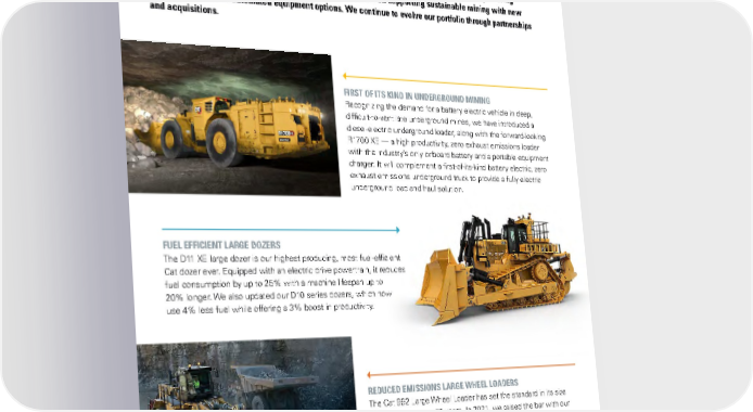 ENERGY, FUEL ECONOMY & EMISSIONS REVOLUTIONIZING RESOURCE INDUSTRIES Our technology-dependent world relies on mined minerals — especially when it comes to powering emerging renewable energy solutions. In 2021, we focused on supporting sustainable mining with new battery electric and automated equipment options. We continue to evolve our portfolio through partnerships and acquisitions. FIRST OF ITS KIND IN UNDERGROUND MINING Recognizing the demand for a battery electric vehicle in deep, difficult-to-ventilate underground mines, we have introduced a diesel-electric underground loader, along with the forward-looking R1700 XE — a high productivity, zero exhaust emissions loader with the industry’s only onboard battery and a portable equipment charger. It will complement a first-of-its-kind battery electric, zero exhaust emissions underground truck to provide a fully electric underground load and haul solution. FUEL EFFICIENT LARGE DOZERS The D11 XE large dozer is our highest producing, most fuel-efficient Cat dozer ever. Equipped with an electric drive powertrain, it reduces fuel consumption by up to 25% with a machine lifespan up to 20% longer. We also updated our D10 series dozers, which now use 4% less fuel while offering a 3% boost in productivity. REDUCED EMISSIONS LARGE WHEEL LOADERS The Cat 992 Large Wheel Loader has set the standard in its size class for more than 50 years. In 2021, we raised the bar with our new 992, which has been demonstrated to produce up to 32% less emissions than its 992K counterpart. 26CATERPILLAR 2021 SUSTAINABILITY REPORT