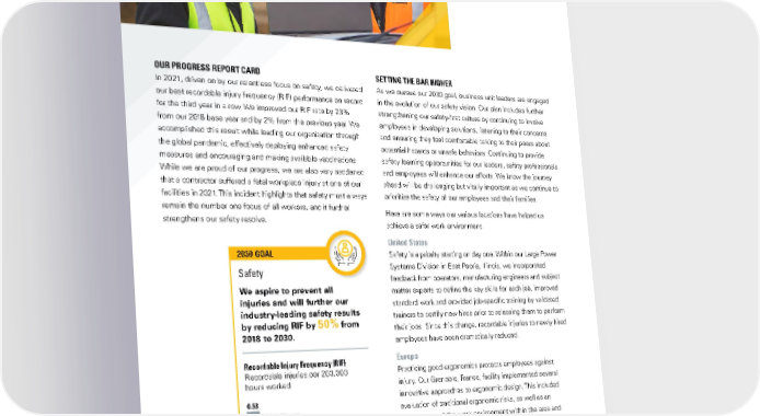 PEOPLE OUR PROGRESS REPORT CARD SETTING THE BAR HIGHER In 2021, driven on by our relentless focus on safety, we delivered As we pursue our 2030 goal, business unit leaders are engaged our best recordable injury frequency (RIF) performance on record in the evolution of our safety vision. Our plan includes further for the third year in a row. We improved our RIF rate by 23% strengthening our safety-first culture by continuing to involve from our 2018 base year and by 2% from the previous year. We employees in developing solutions, listening to their concerns accomplished this result while leading our organization through and ensuring they feel comfortable talking to their peers about the global pandemic, effectively deploying enhanced safety potential hazards or unsafe behaviors. Continuing to provide measures and encouraging and making available vaccinations. safety learning opportunities for our leaders, safety professionals While we are proud of our progress, we are also very saddened and employees will enhance our efforts. We know the journey that a contractor suffered a fatal workplace injury at one of our ahead will be challenging but vitally important as we continue to facilities in 2021. This incident highlights that safety must always prioritize the safety of our employees and their families. remain the number one focus of all workers, and it further Here are some ways our various locations have helped us strengthens our safety resolve. achieve a safer work environment. United States 2030 GOAL Safety is a priority starting on day one. Within our Large Power Safety Systems Division in East Peoria, Illinois, we incorporated feedback from operators, manufacturing engineers and subject We aspire to prevent all matter experts to define the key skills for each job, improved injuries and will further our standard work and provided job-specific training by validated industry-leading safety results trainers to certify new hires prior to releasing them to perform by reducing RIF by 50% from their jobs. Since this change, recordable injuries to newly hired 2018 to 2030. employees have been dramatically reduced. Recordable Injury Frequency (RIF) Europe Recordable injuries per 200,000 Practicing good ergonomics protects employees against hours worked injury. Our Grenoble, France, facility implemented several 0.53 innovative approaches to ergonomic design. This included 0.43 0.42 0.41 evaluation of traditional ergonomic risks, as well as an 0.27 assessment of the work environment within the area and operator feedback about the work. These approaches identified several ways we could use technology to perform a task and protect employees from potential harm. This facility recently ’18 ’19 ’20 ’21 ’30 celebrated one year free from ergonomic-related injuries. 42CATERPILLAR 2021 SUSTAINABILITY REPORT