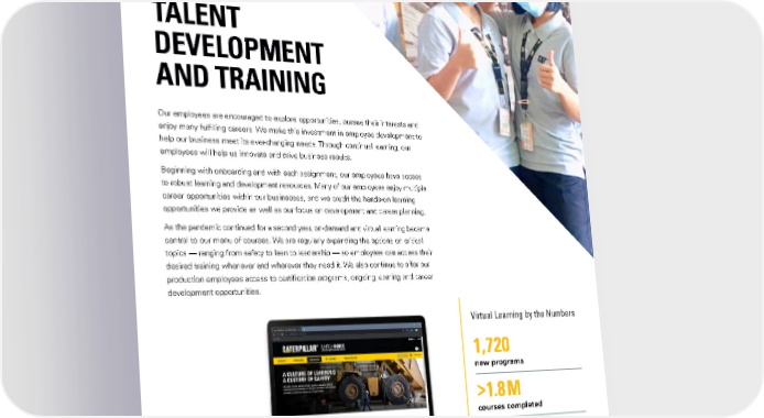 PEOPLE TALENT DEVELOPMENT AND TRAINING Our employees are encouraged to explore opportunities, pursue their interests and enjoy many fulfilling careers. We make this investment in employee development to help our business meet its ever-changing needs. Through continual learning, our employees will help us innovate and drive business results. Beginning with onboarding and with each assignment, our employees have access to robust learning and development resources. Many of our employees enjoy multiple career opportunities within our businesses, and we credit the hands-on learning opportunities we provide as well as our focus on development and career planning. As the pandemic continued for a second year, on-demand and virtual learning became central to our menu of courses. We are regularly expanding the options on critical topics — ranging from safety to lean to leadership — so employees can access their desired training whenever and wherever they need it. We also continue to offer our production employees access to certification programs, ongoing learning and career development opportunities. Virtual Learning by the Numbers 1,720 new programs >1.8M courses completed 71% apply learning to their work 44CATERPILLAR 2021 SUSTAINABILITY REPORT