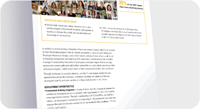 PEOPLE Nearly 25% of our 2021 intern class were returning interns. INVESTED IN EARLY CAREER TALENT In 2021, we welcomed more than 300 interns from We hire high school and college students directly into student programs that provide in-person and experiential 79 colleges and universities to our Caterpillar family and learning to sharpen their skills and develop hands-on provided opportunities aligned with their career interest knowledge of our business. and/or field of academic study. In addition to online learning, Caterpillar offers development opportunities for employees to lead challenging projects, take on stretch assignments, serve on committees, join Employee Resources Groups, work with mentors and job shadow others — all aimed at fostering collaboration and learning. With a business case for investment and their manager’s sponsorship, hundreds of employees each year deepen their knowledge, pursue new career paths and add to their credentials by taking advantage of our tuition assistance program, which covers most of their expenses for tuition, fees and books. Through deliberate succession planning, we identify and prepare leaders for new opportunities across the company. Intentional development planning helps our employees identify and work on the skills they need now and in the future. DEVELOPMENT OPPORTUNITIES • Cust omized training programs in Acuna, Mexico, met the increase in demand for welders by developing locally customized training programs aimed at the need for more specialized workers. Through a partnership with CONALEP, a local technical school, we developed a customized training program that increased class sizes and reduced the lead time for new welders to join our production line, resulting in 117 new welding certifications. • Developing front-line leaders is an increased focus through a new Leadership Development (LD) program called LD200, based on real-life challenges and opportunities leaders face. The program is offered through on-demand and in-person sessions. In 2022, an estimated 2,000 leaders in multiple countries will experience the inaugural program. 45CATERPILLAR 2021 SUSTAINABILITY REPORT