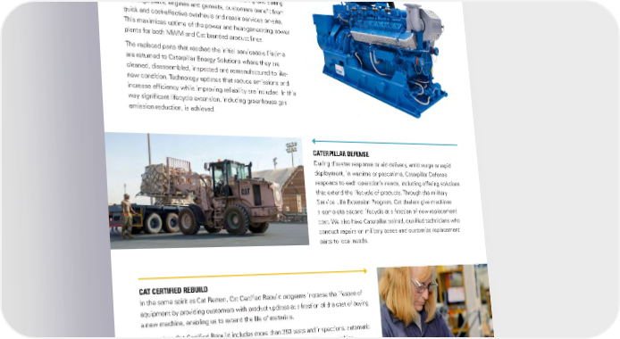 REMANUFACTURING CATERPILLAR ENERGY SOLUTIONS X-CHANGE The X-Change program is a parts replacement program for medium and large MWM branded engines and a perfect example of circular economy principles. By remanufacturing and selling X-Change parts, engines and gensets, customers benefit from quick and cost-effective overhauls and repair services on-site. This maximizes uptime of the power and heat-generating power plants for both MWM and Cat branded product lines. The replaced parts that reached the initial serviceable lifetime are returned to Caterpillar Energy Solutions where they are cleaned, disassembled, inspected and remanufactured to like- new condition. Technology updates that reduce emissions and increase efficiency while improving reliability are included. In this way significant lifecycle extension, including greenhouse gas emission reduction, is achieved. CATERPILLAR DEFENSE During disaster response or aid delivery, amid surge or rapid deployment, in wartime or peacetime, Caterpillar Defense responds to each operation’s needs, including offering solutions that extend the lifecycle of products. Through the military Service Life Extension Program, Cat dealers give machines a complete second lifecycle at a fraction of new replacement cost. We also have Caterpillar trained, qualified technicians who conduct repairs on military bases and customize replacement parts to local needs. CAT CERTIFIED REBUILD In the same spirit as Cat Reman, Cat Certified Rebuild programs increase the lifespan of equipment by providing customers with product updates at a fraction of the cost of buying a new machine, enabling us to extend the life of materials. A complete Cat Certified Rebuild includes more than 350 tests and inspections, automatic replacement or reconditioning of approximately 7,000 parts and a like-new machine warranty. Trained dealer service professionals perform rebuild work using genuine equipment and parts while incorporating the latest engineering updates. Caterpillar provides information, data, training and service tools to help dealers decide which parts to reuse to achieve the expected longevity of rebuilt components. Since 1985, Caterpillar and our dealers have rebuilt more than 37,000 machines, powertrains and components. 38CATERPILLAR 2021 SUSTAINABILITY REPORT
