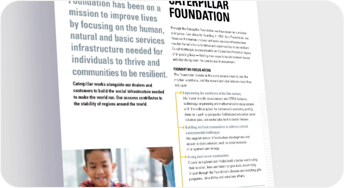 PHILANTHROPY Since 1952, the Caterpillar CATERPILLAR Foundation has been on a FOUNDATION mission to improve lives by focusing on the human, Through the Caterpillar Foundation we have been on a mission to improve lives since its founding in 1952. As a Foundation, we natural and basic services focus on the human, natural and basic services infrastructure needed for individuals to thrive and communities to be resilient. Our philanthropic purpose builds on Caterpillar’s historical legacy infrastructure needed for of improving lives — finding new ways to tackle modern issues individuals to thrive and and identifying room for continuous improvement. FOUNDATION FOCUS AREAS communities to be resilient. The Foundation invests in the skills people need to join the modern workforce, and the natural and vital infrastructure they Caterpillar works alongside our dealers and rely upon. customers to build the social infrastructure needed Empowering the workforce of the 21st century to make the world run. Our success contributes to We invest in skills development and STEM (science, the stability of regions around the world. technology, engineering and mathematics) to equip people with the skills required for tomorrow’s economy, putting them on a path to prosperity. Skills-based education leads to better jobs, and better jobs lead to better futures. Building resilient communities to address critical environmental challenges We support natural infrastructure development and access to basic services, such as water resource management and energy. Giving back in our communities Caterpillar’s global team helps build a better world using their passion, time and talent to give back, maximizing impact through the Foundation’s disaster and matching gifts programs, United Way and volunteer efforts. Nearly $851 million invested in global communities since 1952. 51CATERPILLAR 2021 SUSTAINABILITY REPORT