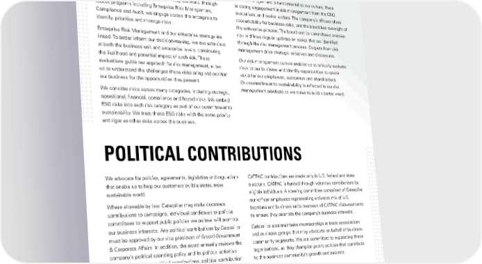 CORPORATE GOVERNANCE RISK MANAGEMENT Risk is an inherent part of conducting global business, and As risk management is fundamental to our culture, there managing risk is fundamental to the way we work. Through is strong engagement in risk management from the CEO, robust programs including Enterprise Risk Management, executives, and senior leaders. The company’s officers share Compliance and Audit, we engage across the enterprise to accountability for business risks, and the board has oversight of identify, prioritize and manage risks. the enterprise process. The board and its committees oversee Enterprise Risk Management and our enterprise strategy are risk and have regular updates on topics that are identified linked: To better inform our decision-making, we evaluate risks through the risk management process. Outputs from risk at both the business unit and enterprise levels, considering management drive strategic initiatives and disclosures. the likelihood and potential impact of each risk. These Our risk management culture enables us to critically evaluate evaluations guide our approach for risk management, allow risks to our business and identify opportunities to create us to understand the challenges these risks bring and position value for our employees, customers and shareholders. our business for the opportunities they present. Our commitment to sustainability is reflected in our risk We consider risks across many categories, including strategic, management practices as we strive to build a better world. operational, financial, compliance and hazard risks. We embed ESG risks into each risk category as part of our commitment to sustainability. We treat these ESG risks with the same priority and rigor as other risks across the business. POLITICAL CONTRIBUTIONS We advocate for policies, agreements, legislation and regulations CATPAC contributions are made only in U.S. federal and state that enable us to help our customers build a better, more elections. CATPAC is funded through voluntary contributions by sustainable world. eligible individuals. A steering committee comprised of Caterpillar Where allowable by law, Caterpillar may make corporate non-officer employees representing a diverse mix of U.S. contributions to campaigns, individual candidates or political locations and business units oversees all CATPAC disbursements committees to support public policies we believe will promote to ensure they promote the company’s business interests. our business interests. Any political contributions by Caterpillar Caterpillar also maintains memberships in trade associations must be approved by our vice president of Global Government and business groups that may advocate on behalf of business & Corporate Affairs. In addition, the board annually reviews the community segments. We are committed to supporting these company’s political spending policy and its political activities organizations, as they champion public policies that contribute including corporate political contributions, political contribution to the business community’s growth and success. activities of the Caterpillar Political Action Committee (CATPAC), trade association participation and Caterpillar’s significant Additional information regarding Caterpillar’s lobbying priorities. corporate contributions, CATPAC contributions and trade association memberships is available on our political engagement website. 14CATERPILLAR 2021 SUSTAINABILITY REPORT