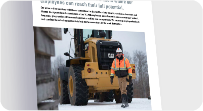 PEOPLE We strive to create an environment where our employees can reach their full potential. Our Values-driven culture reflects our commitment to the health, safety, integrity, excellence, teamwork and diverse backgrounds and experiences of our 107,700 employees. Our values unite us across our many cultural, language, geographic and business boundaries, making us a stronger team. We encourage employee feedback and continually make improvements to help our team members do the work that matters. 40CATERPILLAR 2021 SUSTAINABILITY REPORT