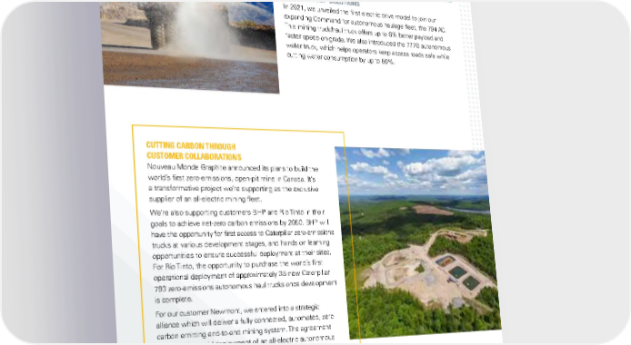 ENERGY, FUEL ECONOMY & EMISSIONS ™ CAT MINESTAR SOLUTIONS In 2021, we unveiled the first electric drive model to join our expanding Command for autonomous haulage fleet, the 794 AC. This mining truck/haul truck offers up to 8% better payload and faster speed-on-grade. We also introduced the 777G autonomous water truck, which helps operators keep access roads safe while cutting water consumption by up to 50%. CUTTING CARBON THROUGH CUSTOMER COLLABORATIONS Nouveau Monde Graphite announced its plans to build the world’s first zero-emissions, open-pit mine in Canada. It’s a transformative project we’re supporting as the exclusive supplier of an all-electric mining fleet. We’re also supporting customers BHP and Rio Tinto in their goals to achieve net-zero carbon emissions by 2050. BHP will have the opportunity for first access to Caterpillar zero-emissions trucks at various development stages, and hands on learning opportunities to ensure successful deployment at their sites. For Rio Tinto, the opportunity to purchase the world’s first operational deployment of approximately 35 new Caterpillar 793 zero-emissions autonomous haul trucks once development is complete. For our customer Newmont, we entered into a strategic alliance which will deliver a fully connected, automated, zero carbon emitting end-to-end mining system. The agreement includes the rapid deployment of an all-electric autonomous haulage fleet to support their operations on two continents. And we’re also developing our first battery electric zero exhaust emissions underground truck, which will complete our fully electric underground load and haul solution. 27CATERPILLAR 2021 SUSTAINABILITY REPORT