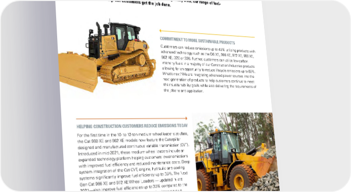 ENERGY, FUEL ECONOMY & EMISSIONS BUILDING BETTER JOBSITES — CONSTRUCTION INDUSTRIES The construction industry demands sustainable solutions that are tough, reliable and versatile. From navigating narrow doorways to climbing rocky hills, our range of fuel- efficient products help our customers get the job done. COMMITMENT TO MORE SUSTAINABLE PRODUCTS Customers can reduce emissions up to 45% utilizing products with advanced technology such as the D6 XE, 966 XE, 972 XE, 980 XE, 982 XE, 320 or 336. Further, customers can utilize low-carbon intensity fuels in a majority of our Construction Industries products allowing for an opportunity to reduce lifecycle emissions up to 85%. What’s next? We are integrating advanced power sources into the next generation of products to help customers continue to meet their sustainability goals while also delivering the requirements of the jobsite and application. HELPING CONSTRUCTION CUSTOMERS REDUCE EMISSIONS TODAY For the first time in the 10- to 12-ton medium wheel loader size class, the Cat 980 XE and 982 XE models now feature the Caterpillar designed and manufactured continuous variable transmission (CVT). Introduced in mid-2021, these medium wheel loaders include an expanded technology platform helping customers lower emissions with improved fuel efficiency and reduced maintenance costs. Deep system integration of the Cat CVT, engine, hydraulic and cooling systems significantly improve fuel efficiency up to 35%. The Next Gen Cat 966 XE and 972 XE Wheel Loaders — updated in late 2021—also improve fuel efficiencies up to 35% compared to the previous powershift models. Prolonged service intervals plus efficiencies gained through integration of the CVT powertrain result in even lower maintenance costs further reducing operating costs. 24CATERPILLAR 2021 SUSTAINABILITY REPORT