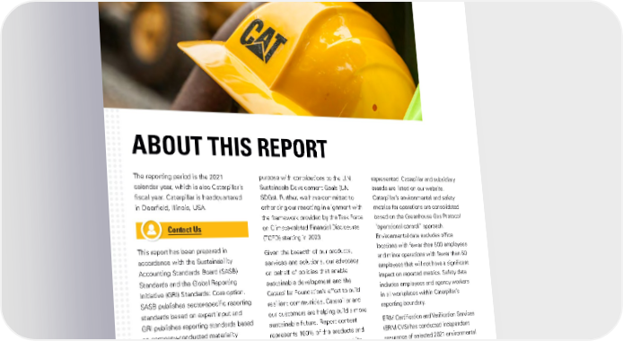 ABOUT THIS REPORT The reporting period is the 2021 purpose with contributions to the U.N. represented. Caterpillar and subsidiary calendar year, which is also Caterpillar’s Sustainable Development Goals (UN brands are listed on our website. fiscal year. Caterpillar is headquartered SDGs). Further, we have committed to Caterpillar’s environmental and safety in Deerfield, Illinois, USA. enhancing our reporting in alignment with metrics for operations are consolidated the framework provided by the Task Force based on the Greenhouse Gas Protocol Contact Us on Climate-related Financial Disclosures “operational control” approach. (TCFD) starting in 2023. Environmental data excludes office This report has been prepared in Given the breadth of our products, locations with fewer than 500 employees accordance with the Sustainability services and solutions, our advocacy and minor operations with fewer than 50 Accounting Standards Board (SASB) on behalf of policies that enable employees that will not have a significant Standards and the Global Reporting sustainable development and the impact on reported metrics. Safety data Initiative (GRI) Standards: Core option. Caterpillar Foundation’s effort to build includes employees and agency workers SASB publishes sector-specific reporting resilient communities, Caterpillar and in all workplaces within Caterpillar’s standards based on expert input and our customers are helping build a more reporting boundary. GRI publishes reporting standards based sustainable future. Report content ERM Certification and Verification Services on company-conducted materiality represents 100% of the products and (ERM CVS) has conducted independent assessments, both designed to allow operations of Caterpillar Inc. and its assurance of selected 2021 environmental businesses to identify the sustainability subsidiaries where we have a controlling and safety data. To understand the scope, issues of highest importance to investors financial interest. Where noted, activities and conclusions of the assurance and most relevant in their industry. We Caterpillar’s independent dealer network process, please see the ERM CVS are also working toward a common global and supplier network are also Assurance Statement. 69CATERPILLAR 2021 SUSTAINABILITY REPORT