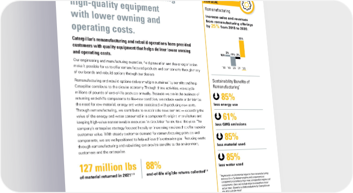 REMANUFACTURING Nearly 50 years of providing 2030 GOAL high-quality equipment Remanufacturing Increase sales and revenues with lower owning and from remanufacturing offerings by 25% from 2018 to 2030. operating costs. 25% Caterpillar’s remanufacturing and rebuild operations have provided customers with quality equipment that helps deliver lower owning N/A 2% -14%-3% and operating costs. Our engineering and manufacturing expertise, field population and dealer organization ’18 ’19 ’20 ’21 ’30 make it possible for us to offer remanufactured products and components through many of our brands and rebuild options through our dealers. Remanufacturing and rebuild options deliver multiple sustainability benefits and help Sustainability Benefits of * Caterpillar contribute to the circular economy. Through these activities, we recycle Remanufacturing millions of pounds of end-of-life products annually. Because we are in the business of 85% returning end-of-life components to like-new condition, we reduce waste and minimize the need for raw material, energy and water associated with producing new parts. less energy use Through remanufacturing, we contribute to sustainable development — extending the value of the energy and water consumed in a component’s original manufacture and 61% keeping high-value nonrenewable resources in circulation for multiple lifecycles. The less GHG emissions company’s enterprise strategy focused heavily on increasing services that offer superior customer value. With steady customer demand for remanufacturing products and components, we are well-positioned to help achieve this enterprise goal. Reducing waste 85% through remanufacturing and rebuilding can provide benefits to the environment, less material used customers and the enterprise. 127 million lbs 88% 85% less water used 7, 8 7, 8 of material returned in 2021 end-of-life eligible returns collected * Represents environmental impacts from remanufacturing process for a Cat Reman engine and components as compared to manufacturing a new, comparable engine and components. Does not include impacts elsewhere in our value chain. Based on a 2006 study done by Caterpillar on the 3412 cylinder head. 35CATERPILLAR 2021 SUSTAINABILITY REPORT