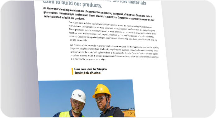 MATERIAL PROCUREMENT Caterpillar responsibly sources the raw materials used to build our products. As the world’s leading manufacturer of construction and mining equipment, off-highway diesel and natural gas engines, industrial gas turbines and diesel-electric locomotives, Caterpillar responsibly sources the raw materials used to build our products. Our supply base includes approximately 27,000 suppliers around the world providing raw materials and manufactured components across broad categories and technologies for aftermarket and production parts. These purchases include a variety of unformed steel products, cut or formed to shape and machined in our facilities; steel and iron castings and forgings, machined to final specification; and finished components, made to Caterpillar or supplier-developed specifications. We also help keep those materials in circulation for as long as possible. We maintain global strategic sourcing models to meet our global facilities’ production needs while building long-term supplier relationships. We look for suppliers and business allies who demonstrate strong values and commit to the ethical principles outlined in the Caterpillar Supplier Code of Conduct. We also expect suppliers to comply with the sound business practices we embrace, follow the law and conduct activities in a manner that respects human rights. Learn more about the Caterpillar Supplier Code of Conduct 32CATERPILLAR 2021 SUSTAINABILITY REPORT