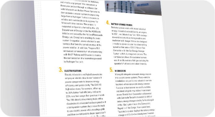ENERGY, FUEL ECONOMY & EMISSIONS 2. HYDROGEN FUEL CELL Fuel cells use renewable hydrogen fuel as a scalable electric power source for stationary and mobile equipment. We announced a three-year project through a collaboration with Microsoft and Ballard Power Systems to demonstrate a power system incorporating large-format hydrogen fuel cells to produce reliable and sustainable backup power for 4. BATTERY-STORED POWER Microsoft data centers. The project is Batteries power work with stored electrical supported and partially funded by the U.S. energy, instead of, or in addition to, an engine. Department of Energy under the H2@Scale In 2021, we debuted our first 100% battery- initiative and backed by the National Renewable powered electric drive mining machine and Energy Lab. Caterpillar is providing the overall made-to-match charger. We’ve also designed system integration, power electronics and a worksite power solution for a land-drilling controls that form the central structure of the operation that pairs a G3512 Natural Gas power solution. In addition, Progress Rail Generator with the Cat Energy Storage announced a memorandum of understanding System with fully integrated controls. The with BNSF Railway and Chevron to advance combination allows the customer to make the demonstration of a locomotive powered use of readily available field gas reducing the by hydrogen fuel cells. operation’s fuel costs and carbon intensity. 3. ELECTRIFICATION 5. MICROGRIDS Electric drivetrains and hybrid powertrains Microgrids integrate renewable energy sources employ an electric drive transmission with into electric power systems. These worksite power components to improve energy installations are particularly valuable in remote efficiency and productivity. The D6E XE locations where renewable energy sources high-drive dozer, for example, offers up like solar or hydropower are readily available to 35% better fuel efficiency and up to and electrical grids may deliver inconsistent 23% less fuel usage than previous models. power. Barrick Gold Corporation collaborated The 795 electric drive mining truck with a with Cat dealer Tractafric to install 7.5 MW of diesel-electric drivetrain has been paired with battery energy storage capacity for its microgrid a trolley-assist system that allows the truck at the Kibali gold mine in the Democratic to use electric power while traveling uphill, Republic of the Congo. Now operational, and then switch back to diesel operation if Tractafric’s solution deploys the battery energy electricity isn’t readily available. The trolley storage and Cat bi-directional power inverters system reduces fuel burn by more than to provide grid stability, while the Cat Microgrid 90% while on trolley. Controller seamlessly integrates up to 45 MW of power generated by three hydroelectric power stations and 36 Cat 3512 diesel generator sets. 22CATERPILLAR 2021 SUSTAINABILITY REPORT