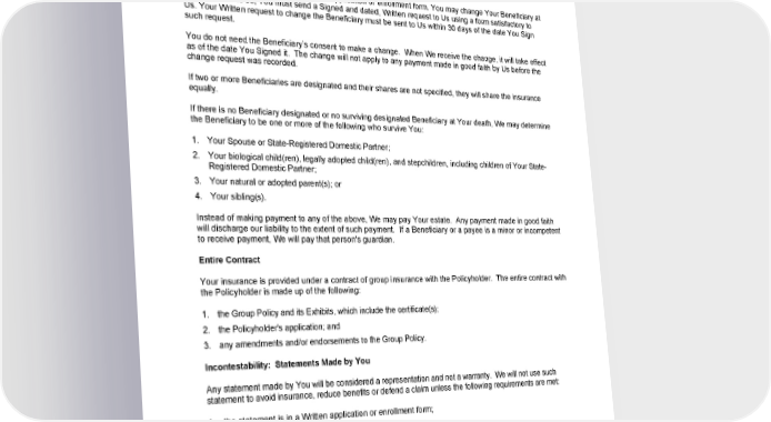 GENERAL PROVISIONS Assignment The rights and benefits under the Group Policy are not assignable prior to a claim for benefits, except as required by law. We are not responsible for the validity of an assignment. Beneficiary You may designate a Beneficiary in Your application or enrollment form. You may change Your Beneficiary at any time. To do so, You must send a Signed and dated, Written request to Us using a form satisfactory to Us. Your Written request to change the Beneficiary must be sent to Us within 30 days of the date You Sign such request. You do not need the Beneficiary’s consent to make a change. When We receive the change, it will take effect as of the date You Signed it. The change will not apply to any payment made in good faith by Us before the change request was recorded. If two or more Beneficiaries are designated and their shares are not specified, they will share the insurance equally. If there is no Beneficiary designated or no surviving designated Beneficiary at Your death, We may determine the Beneficiary to be one or more of the following who survive You: 1. Your Spouse or State-Registered Domestic Partner; 2. Your biological child(ren), legally adopted child(ren), and stepchildren, including children of Your State- Registered Domestic Partner; 3. Your natural or adopted parent(s); or 4. Your sibling(s). Instead of making payment to any of the above, We may pay Your estate. Any payment made in good faith will discharge our liability to the extent of such payment. If a Beneficiary or a payee is a minor or incompetent to receive payment, We will pay that person's guardian. Entire Contract Your insurance is provided under a contract of group insurance with the Policyholder. The entire contract with the Policyholder is made up of the following: 1. the Group Policy and its Exhibits, which include the certificate(s); 2. the Policyholder's application; and 3. any amendments and/or endorsements to the Group Policy. Incontestability: Statements Made by You Any statement made by You will be considered a representation and not a warranty. We will not use such statement to avoid insurance, reduce benefits or defend a claim unless the following requirements are met: 1. the statement is in a Written application or enrollment form; 2. You have Signed the application or enrollment form; and 3. a copy of the application or enrollment form has been given to You or Your Beneficiary. We will not use Your statements which relate to insurability to contest life insurance after it has been in force for 2 years during Your life. In addition, We will not use such statements to contest an increase or benefit addition to such insurance after the increase or benefit has been in force for 2 years during Your life. GCERT2024-WSHCA-WA-LIFE-RETIREE1 29