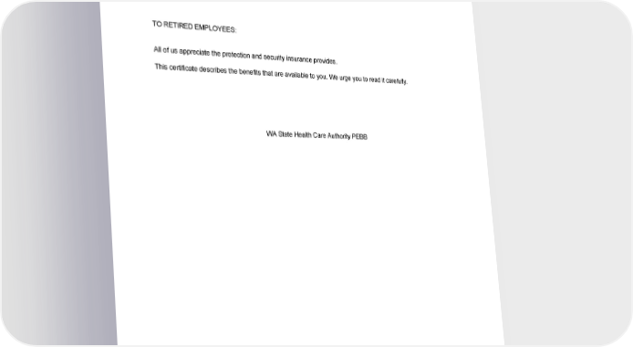 WA State Health Care Authority PEBB 626 8th Avenue SE P.O. Box 42684 Olympia, WA 98504-2684 TO RETIRED EMPLOYEES: All of us appreciate the protection and security insurance provides. This certificate describes the benefits that are available to you. We urge you to read it carefully. WA State Health Care Authority PEBB