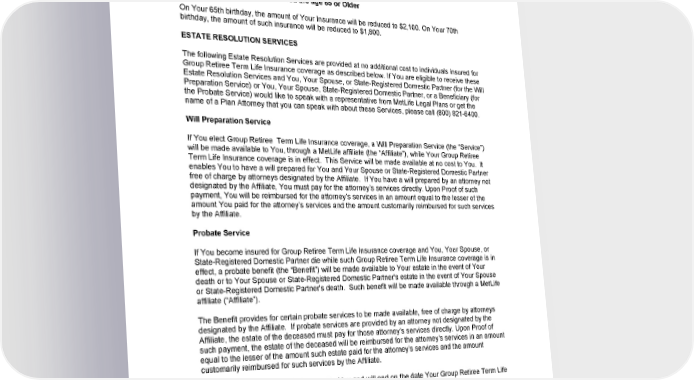 SCHEDULE OF BENEFITS (continued) Class 2 Legacy Retiree Term Life Plan: Retirees enrolled in the Policyholder’s $3,000 benefit plan prior to January 1, 2017 who did not move to the Policyholder’s new Class 1 Retiree Term Life Plan during the 2016 open enrollment period. ........................................................................... $3,000 Class 2 Retired Employees - If You are age 65 or Older On Your 65th birthday, the amount of Your Insurance will be reduced to $2,100. On Your 70th birthday, the amount of such insurance will be reduced to $1,800. ESTATE RESOLUTION SERVICES The following Estate Resolution Services are provided at no additional cost to individuals insured for Group Retiree Term Life Insurance coverage as described below. If You are eligible to receive these Estate Resolution Services and You, Your Spouse, or State-Registered Domestic Partner (for the Will Preparation Service) or You, Your Spouse, State-Registered Domestic Partner, or a Beneficiary (for the Probate Service) would like to speak with a representative from MetLife Legal Plans or get the name of a Plan Attorney that you can speak with about these Services, please call (800) 821-6400. Will Preparation Service If You elect Group Retiree Term Life Insurance coverage, a Will Preparation Service (the “Service”) will be made available to You, through a MetLife affiliate (the “Affiliate”), while Your Group Retiree Term Life Insurance coverage is in effect. This Service will be made available at no cost to You. It enables You to have a will prepared for You and Your Spouse or State-Registered Domestic Partner free of charge by attorneys designated by the Affiliate. If You have a will prepared by an attorney not designated by the Affiliate, You must pay for the attorney’s services directly. Upon Proof of such payment, You will be reimbursed for the attorney’s services in an amount equal to the lesser of the amount You paid for the attorney’s services and the amount customarily reimbursed for such services by the Affiliate. Probate Service If You become insured for Group Retiree Term Life Insurance coverage and You, Your Spouse, or State-Registered Domestic Partner die while such Group Retiree Term Life Insurance coverage is in effect, a probate benefit (the “Benefit”) will be made available to Your estate in the event of Your death or to Your Spouse or State-Registered Domestic Partner's estate in the event of Your Spouse or State-Registered Domestic Partner's death. Such benefit will be made available through a MetLife affiliate (“Affiliate”). The Benefit provides for certain probate services to be made available, free of charge by attorneys designated by the Affiliate. If probate services are provided by an attorney not designated by the Affiliate, the estate of the deceased must pay for those attorney’s services directly. Upon Proof of such payment, the estate of the deceased will be reimbursed for the attorney’s services in an amount equal to the lesser of the amount such estate paid for the attorney’s services and the amount customarily reimbursed for such services by the Affiliate. This Benefit will be provided at no cost to You and will end on the date Your Group Retiree Term Life Insurance coverage ends. GCERT2016-WSHCA-WA-LIFE-RETIREE1 20