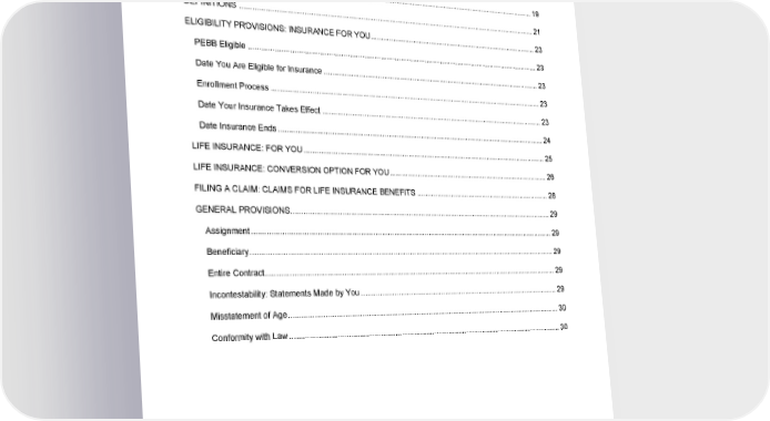 TABLE OF CONTENTS Section Page CERTIFICATE FACE PAGE .............................................................................................................................. 1 NOTICES ......................................................................................................................................................... 17 SCHEDULE OF BENEFITS ............................................................................................................................. 19 DEFINITIONS .................................................................................................................................................. 21 ELIGIBILITY PROVISIONS: INSURANCE FOR YOU ..................................................................................... 23 PEBB Eligible ............................................................................................................................................... 23 Date You Are Eligible for Insurance ............................................................................................................. 23 Enrollment Process ...................................................................................................................................... 23 Date Your Insurance Takes Effect ............................................................................................................... 23 Date Insurance Ends .................................................................................................................................... 24 LIFE INSURANCE: FOR YOU ......................................................................................................................... 25 LIFE INSURANCE: CONVERSION OPTION FOR YOU ................................................................................. 26 FILING A CLAIM: CLAIMS FOR LIFE INSURANCE BENEFITS .................................................................... 28 GENERAL PROVISIONS ................................................................................................................................. 29 Assignment ................................................................................................................................................... 29 Beneficiary .................................................................................................................................................... 29 Entire Contract .............................................................................................................................................. 29 Incontestability: Statements Made by You ................................................................................................... 29 Misstatement of Age ..................................................................................................................................... 30 Conformity with Law ..................................................................................................................................... 30 GCERT2024-WSHCA-WA-LIFE-RETIREE1 18
