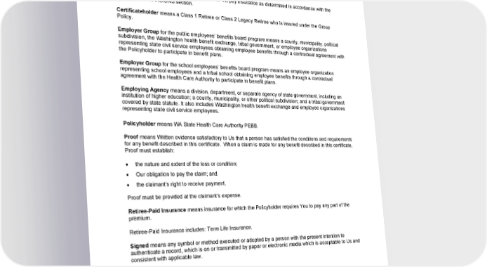 DEFINITIONS As used in this certificate, the terms listed below will have the meanings set forth below. When defined terms are used in this certificate, they will appear with initial capitalization. The plural use of a term defined in the singular will share the same meaning. Basic Life Insurance means Your basic life insurance coverage as an employee insured under the WA State Health Care Authority PEBB or WA State Health Care Authority SEBB group policy issued by Us. Beneficiary means the person(s) to whom We will pay insurance as determined in accordance with the GENERAL PROVISIONS section. Certificateholder means a Class 1 Retiree or Class 2 Legacy Retiree who is insured under the Group Policy. Employer Group for the public employees’ benefits board program means a county, municipality, political subdivision, the Washington health benefit exchange, tribal government, or employee organizations representing state civil service employees obtaining employee benefits through a contractual agreement with the Policyholder to participate in benefit plans. Employer Group for the school employees’ benefits board program means an employee organization representing school employees and a tribal school obtaining employee benefits through a contractual agreement with the Health Care Authority to participate in benefit plans. Employing Agency means a division, department, or separate agency of state government, including an institution of higher education; a county, municipality, or other political subdivision; and a tribal government covered by state statute. It also includes Washington health benefit exchange and employee organizations representing state civil service employees. Policyholder means WA State Health Care Authority PEBB. Proof means Written evidence satisfactory to Us that a person has satisfied the conditions and requirements for any benefit described in this certificate. When a claim is made for any benefit described in this certificate, Proof must establish: the nature and extent of the loss or condition; Our obligation to pay the claim; and the claimant’s right to receive payment. Proof must be provided at the claimant’s expense. Retiree-Paid Insurance means insurance for which the Policyholder requires You to pay any part of the premium. Retiree-Paid Insurance includes: Term Life Insurance. Signed means any symbol or method executed or adopted by a person with the present intention to authenticate a record, which is on or transmitted by paper or electronic media which is acceptable to Us and consistent with applicable law. Spouse means Your legal spouse. State-Registered Domestic Partner as defined in state statute and substantially equivalent legal unions from jurisdictions as defined in Washington state statute. We, Us and Our mean MetLife. GCERT2024-WSHCA-WA-LIFE-RETIREE1 21