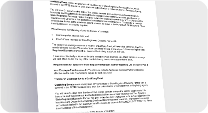ELIGIBILITY PROVISIONS: INSURANCE FOR YOUR DEPENDENTS (continued) Once You have enrolled one Child for a Dependent insurance benefit, each succeeding Child will automatically be covered for such insurance on the date that Child qualifies as a Dependent. If You are not Actively at Work on the date the Dependent Life Insurance would otherwise take effect, the insurance will take effect on the first day of the month following the date You resume Active Work and the Additional Requirement stated below is satisfied. Transfer in Coverage due to a Qualifying Event Qualifying Event means employment of Your Spouse or State-Registered Domestic Partner, who is covered in the PEBB insurance plan, ends due to termination or retirement from an Employing Agency. You will have 31 days from the date of that change to make a request to transfer Supplemental Life Insurance and Supplemental Accidental Death and Dismemberment Insurance that Your Spouse or State-Registered Domestic Partner had prior to the date their employment ends, to Your Dependent Life Insurance and Dependent Accidental Death and Dismemberment Insurance. The transfer in coverage amounts are limited to the maximum benefit amounts as shown in the SCHEDULE OF BENEFITS. There is no Evidence of Insurability required. We will require the following prior to the transfer of coverage: Your completed request form; and Proof of Your marriage or State-Registered Domestic Partnership. The transfer in coverage made as a result of a Qualifying Event, will take effect on the first day of the month following the date We receive Your completed request form and proof of Your marriage or State- Registered Domestic Partnership. You must be Actively at Work on that date. If You are not Actively at Work on the date insurance would otherwise take effect, transfer of coverage will take effect on the first day of the month following the day You resume Active Work. Requirements for Spouse or State-Registered Domestic Partner Dependent Life Insurance: Plan 2 Your Employee-Paid insurance for Your Spouse or State-Registered Domestic Partner will become effective on the date You become eligible for such insurance. Transfer in Coverage due to a Qualifying Event Qualifying Event means employment of Your Spouse or State-Registered Domestic Partner, who is covered in the PEBB insurance plan, ends due to termination or retirement from an Employing Agency. You will have 31 days from the date of that change to make a request to transfer Supplemental Life Insurance and Supplemental Accidental Death and Dismemberment Insurance that Your Spouse or State-Registered Domestic Partner had prior to the date their employment ends, to Your Dependent Life Insurance and Dependent Accidental Death and Dismemberment Insurance. The transfer in coverage amounts are limited to the maximum benefit amounts as shown in the SCHEDULE OF BENEFITS. There is no Evidence of Insurability required. We will require the following prior to the transfer of coverage: Your completed request form; and Proof of Your marriage or State-Registered Domestic Partnership. The transfer in coverage made as a result of a Qualifying Event, will take effect on the first day of the month following the date We receive Your completed request form and proof of Your marriage or State- Registered Domestic Partnership. You must be Actively at Work on that date. GCERT2024-WSHCA-WA-LIFE-EMPLOYEE1 50