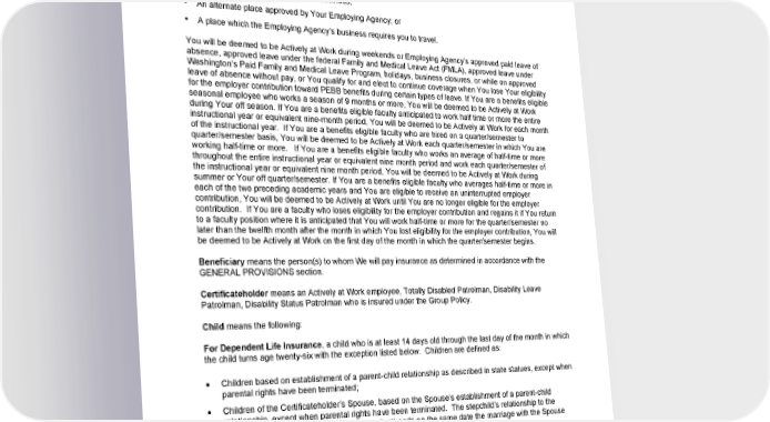 DEFINITIONS As used in this certificate, the terms listed below will have the meanings set forth below. When defined terms are used in this certificate, they will appear with initial capitalization. The plural use of a term defined in the singular will share the same meaning. Actively at Work or Active Work means that You are performing the usual and customary duties of Your job. This must be done at: • Your Employing Agency’s place of business; • An alternate place approved by Your Employing Agency; or • A place which the Employing Agency’s business requires you to travel. You will be deemed to be Actively at Work during weekends or Employing Agency’s approved paid leave of absence, approved leave under the federal Family and Medical Leave Act (FMLA), approved leave under Washington’s Paid Family and Medical Leave Program, holidays, business closures, or while on approved leave of absence without pay, or You qualify for and elect to continue coverage when You lose Your eligibility for the employer contribution toward PEBB benefits during certain types of leave. If You are a benefits eligible seasonal employee who works a season of 9 months or more, You will be deemed to be Actively at Work during Your off season. If You are a benefits eligible faculty anticipated to work half time or more the entire instructional year or equivalent nine-month period, You will be deemed to be Actively at Work for each month of the instructional year. If You are a benefits eligible faculty who are hired on a quarter/semester to quarter/semester basis, You will be deemed to be Actively at Work each quarter/semester in which You are working half-time or more. If You are a benefits eligible faculty who works an average of half-time or more throughout the entire instructional year or equivalent nine month period and work each quarter/semester of the instructional year or equivalent nine month period, You will be deemed to be Actively at Work during summer or Your off quarter/semester. If You are a benefits eligible faculty who averages half-time or more in each of the two preceding academic years and You are eligible to receive an uninterrupted employer contribution, You will be deemed to be Actively at Work until You are no longer eligible for the employer contribution. If You are a faculty who loses eligibility for the employer contribution and regains it if You return to a faculty position where it is anticipated that You will work half-time or more for the quarter/semester no later than the twelfth month after the month in which You lost eligibility for the employer contribution, You will be deemed to be Actively at Work on the first day of the month in which the quarter/semester begins. Beneficiary means the person(s) to whom We will pay insurance as determined in accordance with the GENERAL PROVISIONS section. Certificateholder means an Actively at Work employee, Totally Disabled Patrolman, Disability Leave Patrolman, Disability Status Patrolman who is insured under the Group Policy. Child means the following: For Dependent Life Insurance, a child who is at least 14 days old through the last day of the month in which the child turns age twenty-six with the exception listed below. Children are defined as: Children based on establishment of a parent-child relationship as described in state statues, except when parental rights have been terminated; Children of the Certificateholder’s Spouse, based on the Spouse’s establishment of a parent-child relationship, except when parental rights have been terminated. The stepchild’s relationship to the Certificateholder (and eligibility as a dependent) ends on the same date the marriage with the Spouse ends through divorce, annulment, dissolution, termination, or death; Children for whom the Certificateholder has assumed a legal obligation for total or partial support in anticipation of adoption of the child; GCERT2024-WSHCA-WA-LIFE-EMPLOYEE1 40