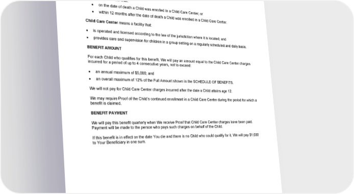 ACCIDENTAL DEATH AND DISMEMBERMENT INSURANCE (continued) ADDITIONAL BENEFIT: CHILD CARE If You die as a result of an accidental injury, We will pay this additional Child Care benefit if: 1. We pay a benefit for loss of Your life under the ACCIDENTAL DEATH AND DISMEMBERMENT INSURANCE section; 2. this benefit is in effect on the date of the injury; and 3. We receive Proof that: on the date of death a Child was enrolled in a Child Care Center; or within 12 months after the date of death a Child was enrolled in a Child Care Center. Child Care Center means a facility that: is operated and licensed according to the law of the jurisdiction where it is located; and provides care and supervision for children in a group setting on a regularly scheduled and daily basis. BENEFIT AMOUNT For each Child who qualifies for this benefit, We will pay an amount equal to the Child Care Center charges incurred for a period of up to 4 consecutive years, not to exceed: an annual maximum of $5,000; and an overall maximum of 12% of the Full Amount shown in the SCHEDULE OF BENEFITS. We will not pay for Child Care Center charges incurred after the date a Child attains age 12. We may require Proof of the Child’s continued enrollment in a Child Care Center during the period for which a benefit is claimed. BENEFIT PAYMENT We will pay this benefit quarterly when We receive Proof that Child Care Center charges have been paid. Payment will be made to the person who pays such charges on behalf of the Child. If this benefit is in effect on the date You die and there is no Child who could qualify for it, We will pay $1,000 to Your Beneficiary in one sum. GCERT2024-WSHCA-WA-LIFE-EMPLOYEE1 77