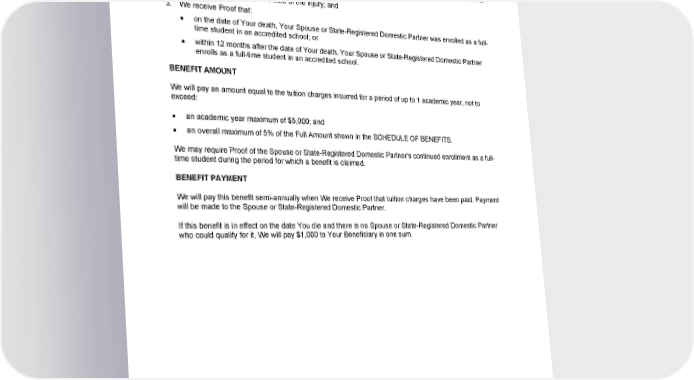 ACCIDENTAL DEATH AND DISMEMBERMENT INSURANCE (continued) ADDITIONAL BENEFIT: SPOUSE OR STATE-REGISTERED DOMESTIC PARTNER EDUCATION If You die as a result of an accidental injury, We will pay this additional Spouse or State-Registered Domestic Partner Education benefit if: 1. We pay a benefit for loss of life under the ACCIDENTAL DEATH AND DISMEMBERMENT INSURANCE section; 2. this benefit is in effect on the date of the injury; and 3. We receive Proof that: on the date of Your death, Your Spouse or State-Registered Domestic Partner was enrolled as a full- time student in an accredited school; or within 12 months after the date of Your death, Your Spouse or State-Registered Domestic Partner enrolls as a full-time student in an accredited school. BENEFIT AMOUNT We will pay an amount equal to the tuition charges incurred for a period of up to 1 academic year, not to exceed: an academic year maximum of $5,000; and an overall maximum of 5% of the Full Amount shown in the SCHEDULE OF BENEFITS. We may require Proof of the Spouse or State-Registered Domestic Partner’s continued enrollment as a full- time student during the period for which a benefit is claimed. BENEFIT PAYMENT We will pay this benefit semi-annually when We receive Proof that tuition charges have been paid. Payment will be made to the Spouse or State-Registered Domestic Partner. If this benefit is in effect on the date You die and there is no Spouse or State-Registered Domestic Partner who could qualify for it, We will pay $1,000 to Your Beneficiary in one sum. GCERT2024-WSHCA-WA-LIFE-EMPLOYEE1 79
