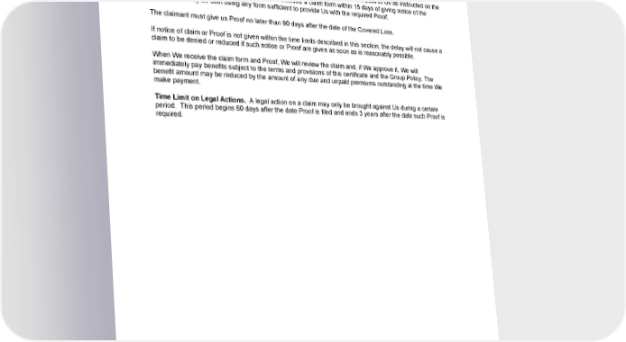 FILING A CLAIM CLAIMS FOR ACCIDENTAL DEATH AND DISMEMBERMENT BENEFITS When there has been a Covered Loss, notify Us by calling 1-866-548-7139. This notice should be given to Us as soon as is reasonably possible but in any case within 20 days of the Covered Loss. The claim form will be sent to You or the beneficiary or beneficiaries of record. The claim form should be completed and sent along with Proof of the Covered Loss to Us as instructed on the claim form. If You or the beneficiary have not received a claim form within 15 days of giving notice of the claim, Proof may be sent using any form sufficient to provide Us with the required Proof. The claimant must give us Proof no later than 90 days after the date of the Covered Loss. If notice of claim or Proof is not given within the time limits described in this section, the delay will not cause a claim to be denied or reduced if such notice or Proof are given as soon as is reasonably possible. When We receive the claim form and Proof, We will review the claim and, if We approve it, We will immediately pay benefits subject to the terms and provisions of this certificate and the Group Policy. The benefit amount may be reduced by the amount of any due and unpaid premiums outstanding at the time We make payment. Time Limit on Legal Actions. A legal action on a claim may only be brought against Us during a certain period. This period begins 60 days after the date Proof is filed and ends 3 years after the date such Proof is required. GCERT2024-WSHCA-WA-LIFE-EMPLOYEE1 83