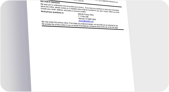 You may ask us for a copy of the personal information we have about you. We will provide it as long as it is reasonably locatable and retrievable. You must make your request in writing listing the account or policy numbers with the information you want to access. For legal reasons, we may not show you privileged information relating to a claim or lawsuit, unless required by law. If you tell us that what we know about you is incorrect, we will review it. If we agree, we will update our records. Otherwise, you may dispute our findings in writing, and we will include your statement whenever we give your disputed information to anyone outside MetLife. SECTION 9: Questions We want you to understand how we protect your privacy. If you have any questions or want more information about this notice, please contact us. A detailed notice shall be furnished to you upon request. When you write, include your name, address, and policy or account number. Send privacy questions to: MetLife Privacy Office P. O. Box 489 Warwick, RI 02887-9954 [email protected] We may revise this privacy notice. If we make any material changes, we will notify you as required by law. We provide this privacy notice to you on behalf of the MetLife companies listed at the top of the first page. CPN–Initial Enr/SOH and SBR (08/21) Page 3
