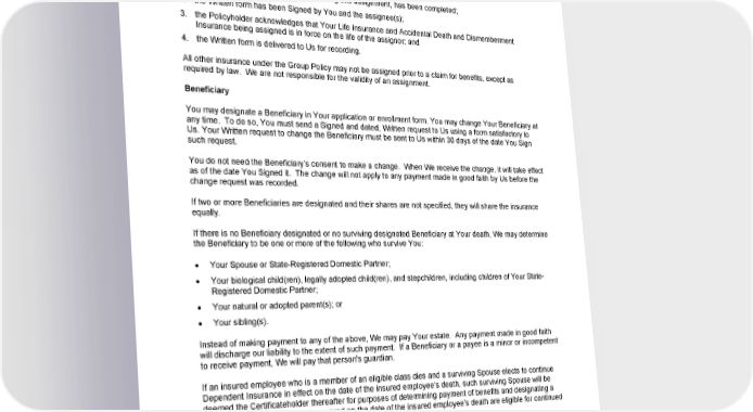 GENERAL PROVISIONS Assignment You may assign Your Life Insurance rights and benefits under the Group Policy as a gift or as a viatical assignment. You may also assign Your Accidental Death and Dismemberment Insurance rights and benefits under the Group Policy as a gift. We will recognize the assignee(s) under such assignment as owner(s) of Your right, title and interest in the Group Policy if: 1. a Written form satisfactory to Us, affirming this assignment, has been completed; 2. the Written form has been Signed by You and the assignee(s); 3. the Policyholder acknowledges that Your Life Insurance and Accidental Death and Dismemberment Insurance being assigned is in force on the life of the assignor; and 4. the Written form is delivered to Us for recording. All other insurance under the Group Policy may not be assigned prior to a claim for benefits, except as required by law. We are not responsible for the validity of an assignment. Beneficiary You may designate a Beneficiary in Your application or enrollment form. You may change Your Beneficiary at any time. To do so, You must send a Signed and dated, Written request to Us using a form satisfactory to Us. Your Written request to change the Beneficiary must be sent to Us within 30 days of the date You Sign such request. You do not need the Beneficiary’s consent to make a change. When We receive the change, it will take effect as of the date You Signed it. The change will not apply to any payment made in good faith by Us before the change request was recorded. If two or more Beneficiaries are designated and their shares are not specified, they will share the insurance equally. If there is no Beneficiary designated or no surviving designated Beneficiary at Your death, We may determine the Beneficiary to be one or more of the following who survive You: Your Spouse or State-Registered Domestic Partner; Your biological child(ren), legally adopted child(ren), and stepchildren, including children of Your State- Registered Domestic Partner; Your natural or adopted parent(s); or Your sibling(s). Instead of making payment to any of the above, We may pay Your estate. Any payment made in good faith will discharge our liability to the extent of such payment. If a Beneficiary or a payee is a minor or incompetent to receive payment, We will pay that person's guardian. If an insured employee who is a member of an eligible class dies and a surviving Spouse elects to continue Dependent Insurance in effect on the date of the insured employee’s death, such surviving Spouse will be deemed the Certificateholder thereafter for purposes of determining payment of benefits and designating a Beneficiary. Only Dependents covered on the date of the insured employee’s death are eligible for continued coverage. For Your Life Insurance for Your Dependents, We will pay You as the Beneficiary if alive. If you are not alive, We may determine the Beneficiary to be one or more of the following who survive You: Your Spouse or State-Registered Domestic Partner; Your biological child(ren), legally adopted child(ren), and stepchildren, including children of Your State- Registered Domestic Partner; GCERT2024-WSHCA-WA-LIFE-EMPLOYEE1 84