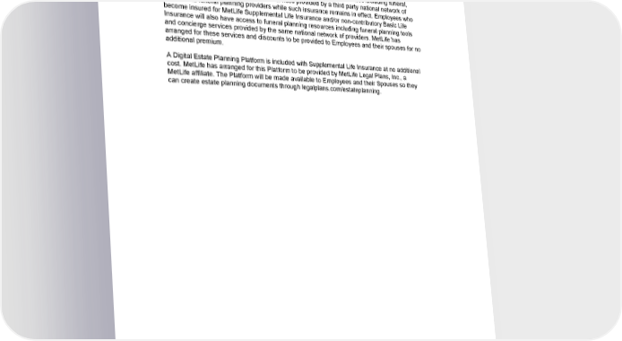 NOTICE This non-insurance benefit does not constitute an insurance funded prearrangement contract, pursuant to RCW 18.39.255. Employees who become insured for MetLife Supplemental Life Insurance and/or non- contributory Basic Life Insurance under the Group Policy are eligible to receive discounts of up to 10% off the service provider’s standard price for certain funeral services including funeral, cremation and cemetery products and services provided by a third party national network of funeral and funeral planning providers while such insurance remains in effect. Employees who become insured for MetLife Supplemental Life Insurance and/or non-contributory Basic Life Insurance will also have access to funeral planning resources including funeral planning tools and concierge services provided by the same national network of providers. MetLife has arranged for these services and discounts to be provided to Employees and their spouses for no additional premium. A Digital Estate Planning Platform is included with Supplemental Life Insurance at no additional cost. MetLife has arranged for this Platform to be provided by MetLife Legal Plans, Inc., a MetLife affiliate. The Platform will be made available to Employees and their Spouses so they can create estate planning documents through legalplans.com/estateplanning. GCERT2024-WSHCA-WA-LIFE-EMPLOYEE1 26