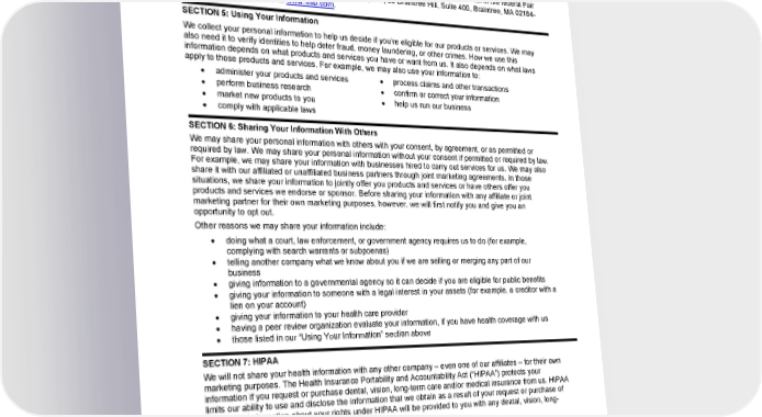 Another source of information is MIB, Inc. (“MIB”). It is a not-for-profit membership organization of insurance companies which operates an information exchange on behalf of its Members. We, or our reinsurers, may make a brief report to MIB. If you apply to another MIB Member company for life or health insurance coverage, or a claim for benefits is submitted, MIB, upon request, will supply such company with the information in its file. Upon receipt of a request from you MIB will arrange disclosure of any information it may have in your file. Please contact MIB at 866-692-6901. If you question the accuracy of information in MIB’s file, you may contact MIB and seek a correction in accordance with the procedures set forth in the federal Fair Credit Reporting Act. You may do so by writing to MIB, Inc., 50 Braintree Hill, Suite 400, Braintree, MA 02184- 8734 or go to MIB website at www.mib.com. SECTION 5: Using Your Information We collect your personal information to help us decide if you’re eligible for our products or services. We may also need it to verify identities to help deter fraud, money laundering, or other crimes. How we use this information depends on what products and services you have or want from us. It also depends on what laws apply to those products and services. For example, we may also use your information to: administer your products and services process claims and other transactions perform business research confirm or correct your information market new products to you help us run our business comply with applicable laws SECTION 6: Sharing Your Information With Others We may share your personal information with others with your consent, by agreement, or as permitted or required by law. We may share your personal information without your consent if permitted or required by law. For example, we may share your information with businesses hired to carry out services for us. We may also share it with our affiliated or unaffiliated business partners through joint marketing agreements. In those situations, we share your information to jointly offer you products and services or have others offer you products and services we endorse or sponsor. Before sharing your information with any affiliate or joint marketing partner for their own marketing purposes, however, we will first notify you and give you an opportunity to opt out. Other reasons we may share your information include: doing what a court, law enforcement, or government agency requires us to do (for example, complying with search warrants or subpoenas) telling another company what we know about you if we are selling or merging any part of our business giving information to a governmental agency so it can decide if you are eligible for public benefits giving your information to someone with a legal interest in your assets (for example, a creditor with a lien on your account) giving your information to your health care provider having a peer review organization evaluate your information, if you have health coverage with us those listed in our “Using Your Information” section above SECTION 7: HIPAA We will not share your health information with any other company – even one of our affiliates – for their own marketing purposes. The Health Insurance Portability and Accountability Act (“HIPAA”) protects your information if you request or purchase dental, vision, long-term care and/or medical insurance from us. HIPAA limits our ability to use and disclose the information that we obtain as a result of your request or purchase of insurance. Information about your rights under HIPAA will be provided to you with any dental, vision, long- term care or medical coverage issued to you. You may obtain a copy of our HIPAA Privacy Notice by visiting our website at www.MetLife.com. For additional information about your rights under HIPAA; or to have a HIPAA Privacy Notice mailed to you, contact us at [email protected], or call us at telephone number (212) 578-0299. SECTION 8: Accessing and Correcting Your Information CPN–Initial Enr/SOH and SBR (08/21) Page 2