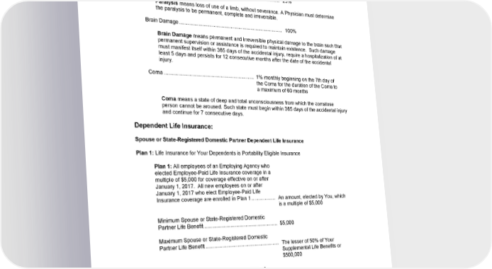 SCHEDULE OF BENEFITS (continued) Loss of hearing means the entire and irrecoverable loss of hearing in both ears that continues for 6 consecutive months following the accidental injury. Paralysis of both arms and both legs ........................................... 100% Paralysis of both legs ................................................................... 50% Paralysis of the arm and leg on either side of the body ............... 50% Paralysis of one arm or leg .......................................................... 25% Paralysis means loss of use of a limb, without severance. A Physician must determine the paralysis to be permanent, complete and irreversible. Brain Damage .............................................................................. 100% Brain Damage means permanent and irreversible physical damage to the brain such that permanent supervision or assistance is required to maintain existence. Such damage must manifest itself within 365 days of the accidental injury, require a hospitalization of at least 5 days and persists for 12 consecutive months after the date of the accidental injury. Coma .................................................................. 1% monthly beginning on the 7th day of the Coma for the duration of the Coma to a maximum of 60 months Coma means a state of deep and total unconsciousness from which the comatose person cannot be aroused. Such state must begin within 365 days of the accidental injury and continue for 7 consecutive days. Dependent Life Insurance: Spouse or State-Registered Domestic Partner Dependent Life Insurance Plan 1: Life Insurance for Your Dependents is Portability Eligible Insurance Plan 1: All employees of an Employing Agency who elected Employee-Paid Life Insurance coverage in a multiple of $5,000 for coverage effective on or after January 1, 2017. All new employees on or after January 1, 2017 who elect Employee-Paid Life Insurance coverage are enrolled in Plan 1 ................... An amount, elected by You, which is a multiple of $5,000 Minimum Spouse or State-Registered Domestic Partner Life Benefit ....................................................... $5,000 Maximum Spouse or State-Registered Domestic Partner Life Benefit ....................................................... The lesser of 50% of Your Supplemental Life Benefits or $500,000 Maximum Amount Allowed Without Evidence of Insurability ..................................................................... $100,000 Accelerated Benefit Option ........................................... Up to 80% of Your Dependent Life amount not to exceed $400,000 GCERT2024-WSHCA-WA-LIFE-EMPLOYEE1 34