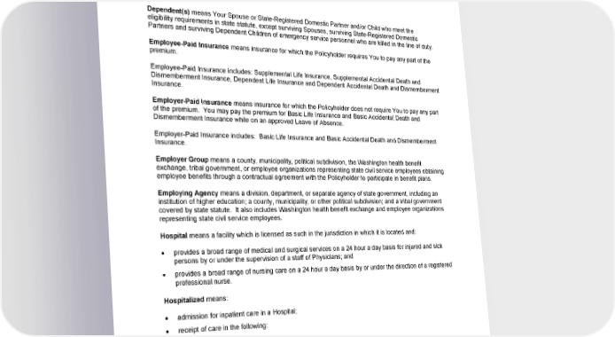 DEFINITIONS (continued) Common Carrier means a government regulated entity that is in the business of transporting fare paying passengers. The term does not include: chartered or other privately arranged transportation; taxis; or limousines. Dependent(s) means Your Spouse or State-Registered Domestic Partner and/or Child who meet the eligibility requirements in state statute, except surviving Spouses, surviving State-Registered Domestic Partners and surviving Dependent Children of emergency service personnel who are killed in the line of duty. Employee-Paid Insurance means insurance for which the Policyholder requires You to pay any part of the premium. Employee-Paid Insurance includes: Supplemental Life Insurance, Supplemental Accidental Death and Dismemberment Insurance, Dependent Life Insurance and Dependent Accidental Death and Dismemberment Insurance. Employer-Paid Insurance means insurance for which the Policyholder does not require You to pay any part of the premium. You may pay the premium for Basic Life Insurance and Basic Accidental Death and Dismemberment Insurance while on an approved Leave of Absence. Employer-Paid Insurance includes: Basic Life Insurance and Basic Accidental Death and Dismemberment Insurance. Employer Group means a county, municipality, political subdivision, the Washington health benefit exchange, tribal government, or employee organizations representing state civil service employees obtaining employee benefits through a contractual agreement with the Policyholder to participate in benefit plans. Employing Agency means a division, department, or separate agency of state government, including an institution of higher education; a county, municipality, or other political subdivision; and a tribal government covered by state statute. It also includes Washington health benefit exchange and employee organizations representing state civil service employees. Hospital means a facility which is licensed as such in the jurisdiction in which it is located and: provides a broad range of medical and surgical services on a 24 hour a day basis for injured and sick persons by or under the supervision of a staff of Physicians; and provides a broad range of nursing care on a 24 hour a day basis by or under the direction of a registered professional nurse. Hospitalized means: admission for inpatient care in a Hospital; receipt of care in the following: a hospice facility; an intermediate care facility; or a long term care facility; or receipt of the following treatment, wherever performed: chemotherapy; GCERT2024-WSHCA-WA-LIFE-EMPLOYEE1 42