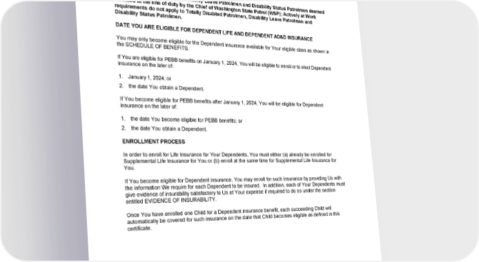 ELIGIBILITY PROVISIONS: DEPENDENT LIFE AND DEPENDENT AD&D INSURANCE ELIGIBLE FOR PEBB BENEFITS: DEPENDENT INSURANCE All Actively at Work employees of an Employing Agency, except for employees of an Employer Group that do not contract with the Policyholder for the insurance benefits described in this certificate. Totally Disabled Patrolmen, Disability Leave Patrolmen and Disability Status Patrolmen deemed disabled in the line of duty by the Chief of Washington State Patrol (WSP); Actively at Work requirements do not apply to Totally Disabled Patrolmen, Disability Leave Patrolmen and Disability Status Patrolmen. DATE YOU ARE ELIGIBLE FOR DEPENDENT LIFE AND DEPENDENT AD&D INSURANCE You may only become eligible for the Dependent insurance available for Your eligible class as shown in the SCHEDULE OF BENEFITS. If You are eligible for PEBB benefits on January 1, 2024, You will be eligible to enroll or to elect Dependent insurance on the later of: 1. January 1, 2024; or 2. the date You obtain a Dependent. If You become eligible for PEBB benefits after January 1, 2024, You will be eligible for Dependent insurance on the later of: 1. the date You become eligible for PEBB benefits; or 2. the date You obtain a Dependent. ENROLLMENT PROCESS In order to enroll for Life Insurance for Your Dependents, You must either (a) already be enrolled for Supplemental Life Insurance for You or (b) enroll at the same time for Supplemental Life Insurance for You. If You become eligible for Dependent insurance, You may enroll for such insurance by providing Us with the information We require for each Dependent to be insured. In addition, each of Your Dependents must give evidence of insurability satisfactory to Us at Your expense if required to do so under the section entitled EVIDENCE OF INSURABILITY. Once You have enrolled one Child for a Dependent insurance benefit, each succeeding Child will automatically be covered for such insurance on the date that Child becomes eligible as defined in this certificate. GCERT2024-WSHCA-WA-LIFE-EMPLOYEE1 48