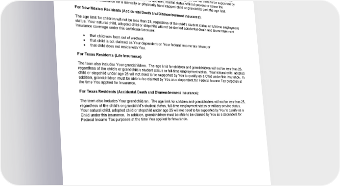 NOTICE FOR RESIDENTS OF LOUISIANA, NEW MEXICO, TEXAS AND UTAH The Definition Of Child Is Modified For The Coverages Listed Below: For Louisiana Residents (Accidental Death and Dismemberment Insurance): The term also includes Your grandchildren residing with You. The age limit for children and grandchildren will not be less than 26, regardless of the child’s or grandchild’s marital status, student status or full-time employment status. Your natural child, adopted child, stepchild or grandchild under age 26 will not need to be supported by You to qualify as a Child under this insurance. In addition, marital status will not prevent or cease the continuation of insurance for a mentally or physically handicapped child or grandchild past the age limit. For New Mexico Residents (Accidental Death and Dismemberment Insurance): The age limit for children will not be less than 25, regardless of the child’s student status or full-time employment status. Your natural child, adopted child or stepchild will not be denied accidental death and dismemberment insurance coverage under this certificate because: that child was born out of wedlock; that child is not claimed as Your dependent on Your federal income tax return; or that child does not reside with You. For Texas Residents (Life Insurance): The term also includes Your grandchildren. The age limit for children and grandchildren will not be less than 25, regardless of the child’s or grandchild’s student status or full-time employment status. Your natural child, adopted child or stepchild under age 25 will not need to be supported by You to qualify as a Child under this insurance. In addition, grandchildren must be able to be claimed by You as a dependent for Federal Income Tax purposes at the time You applied for Insurance. For Texas Residents (Accidental Death and Dismemberment Insurance): The term also includes Your grandchildren. The age limit for children and grandchildren will not be less than 25, regardless of the child’s or grandchild’s student status, full-time employment status or military service status. Your natural child, adopted child or stepchild under age 25 will not need to be supported by You to qualify as a Child under this insurance. In addition, grandchildren must be able to be claimed by You as a dependent for Federal Income Tax purposes at the time You applied for Insurance. GCERT2024-WSHCA-WA-LIFE-EMPLOYEE1 5