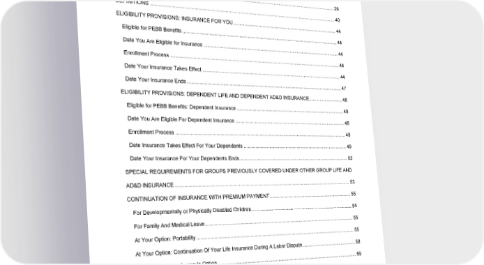 TABLE OF CONTENTS Section Page CERTIFICATE FACE PAGE .............................................................................................................................. 1 NOTICES ........................................................................................................................................................... 3 SCHEDULE OF BENEFITS ............................................................................................................................. 29 DEFINITIONS .................................................................................................................................................. 40 ELIGIBILITY PROVISIONS: INSURANCE FOR YOU ..................................................................................... 44 Eligible for PEBB Benefits ............................................................................................................................ 44 Date You Are Eligible for Insurance ............................................................................................................. 44 Enrollment Process ...................................................................................................................................... 44 Date Your Insurance Takes Effect ............................................................................................................... 44 Date Your Insurance Ends ........................................................................................................................... 47 ELIGIBILITY PROVISIONS: DEPENDENT LIFE AND DEPENDENT AD&D INSURANCE ............................ 48 Eligible for PEBB Benefits: Dependent Insurance ....................................................................................... 48 Date You Are Eligible For Dependent Insurance ......................................................................................... 48 Enrollment Process ...................................................................................................................................... 48 Date Insurance Takes Effect For Your Dependents .................................................................................... 49 Date Your Insurance For Your Dependents Ends ........................................................................................ 52 SPECIAL REQUIREMENTS FOR GROUPS PREVIOUSLY COVERED UNDER OTHER GROUP LIFE AND AD&D INSURANCE ......................................................................................................................................... 53 CONTINUATION OF INSURANCE WITH PREMIUM PAYMENT ................................................................... 55 For Developmentally or Physically Disabled Children .................................................................................. 55 For Family And Medical Leave ..................................................................................................................... 55 At Your Option: Portability ............................................................................................................................ 55 At Your Option: Continuation Of Your Life Insurance During A Labor Dispute ............................................ 58 At The Employing Agency's Option .............................................................................................................. 59 EVIDENCE OF INSURABILITY ................................................................................................................... 60 LIFE INSURANCE: FOR YOU ......................................................................................................................... 61 LIFE INSURANCE: FOR YOUR DEPENDENTS............................................................................................. 62 GCERT2024-WSHCA-WA-LIFE-EMPLOYEE1 27
